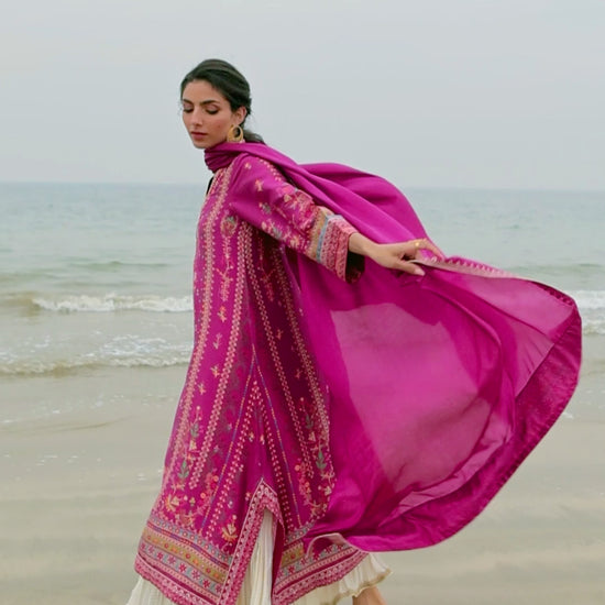The gorgeous pure medium silk dupatta in a striking berry tone with wide printed borders completes your outfit with flair.