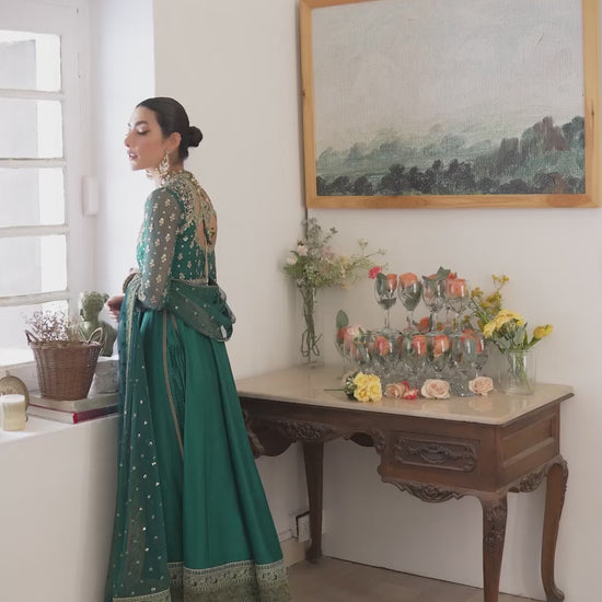 The striking teal kalidaar is the perfectly fuss-free ensemble for any occasion. The richly hand embroidered work on the bodice of kalidaar make this an absolute must have outfit. The delicately embroidered organza sleeves are so very elegant and ideal for any manner of festivity.