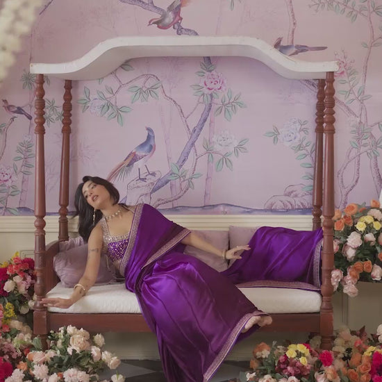 This timeless saree is given a contemporary twist with a striking ombre treatment as the vivid purple smoothly flows into a deeper hue. Cut from pure Charmeuse silk and trimmed with a delicately embroidered border, the simplicity of this saree, speaks volumes. The saree is paired with a stunning halter blouse, cut from pure raw silk, with scalloped straps, richly hand-embroidered with silver nakshi, gota and Swarovski crystal hand work.