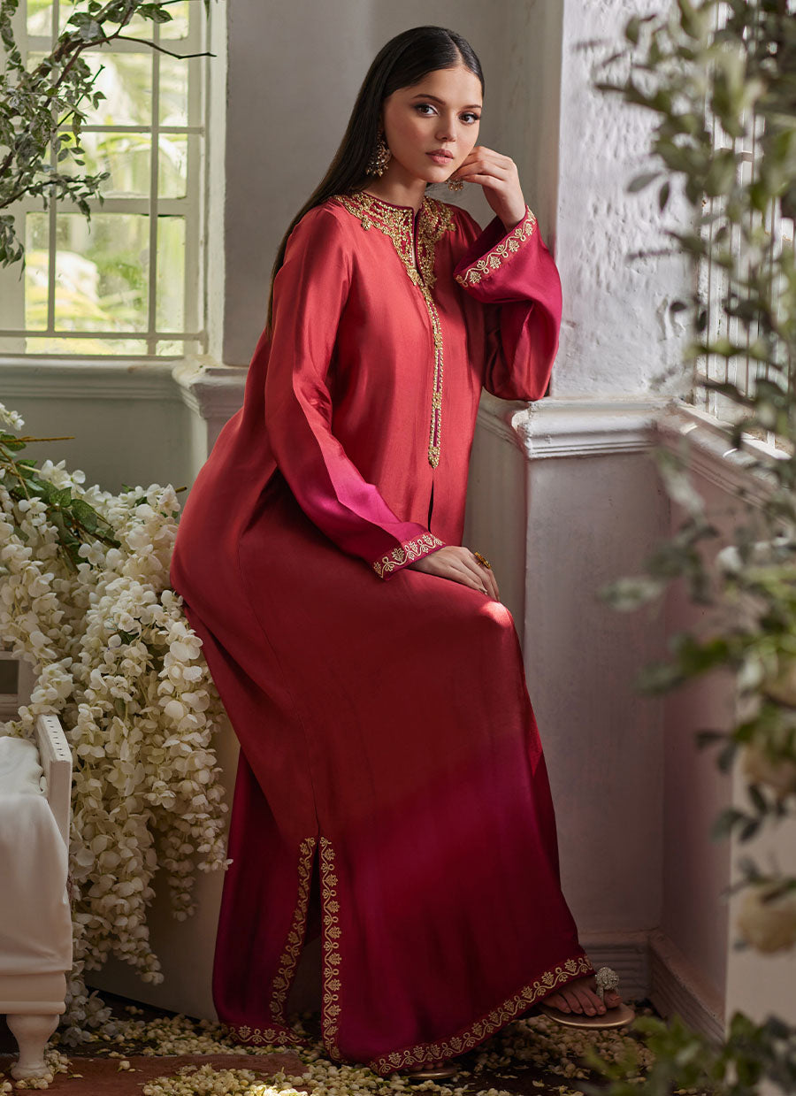 The neckline and sleeves have gold hand work to add a sparkly touch of elegance. Complete your look with our matching raw silk pants (as shown) and sophisticated straight hair for a stand out look in a show stopping ensemble.
