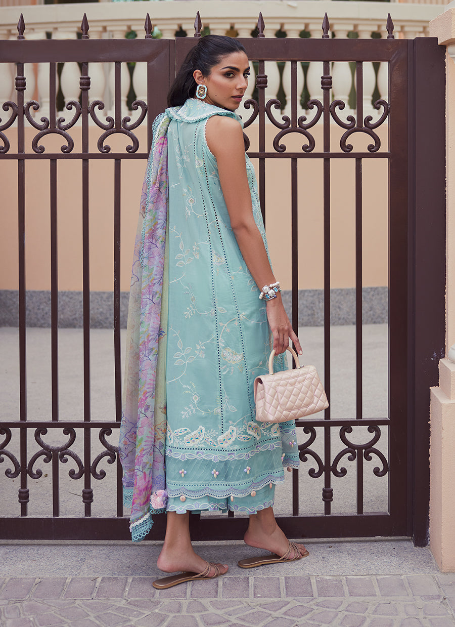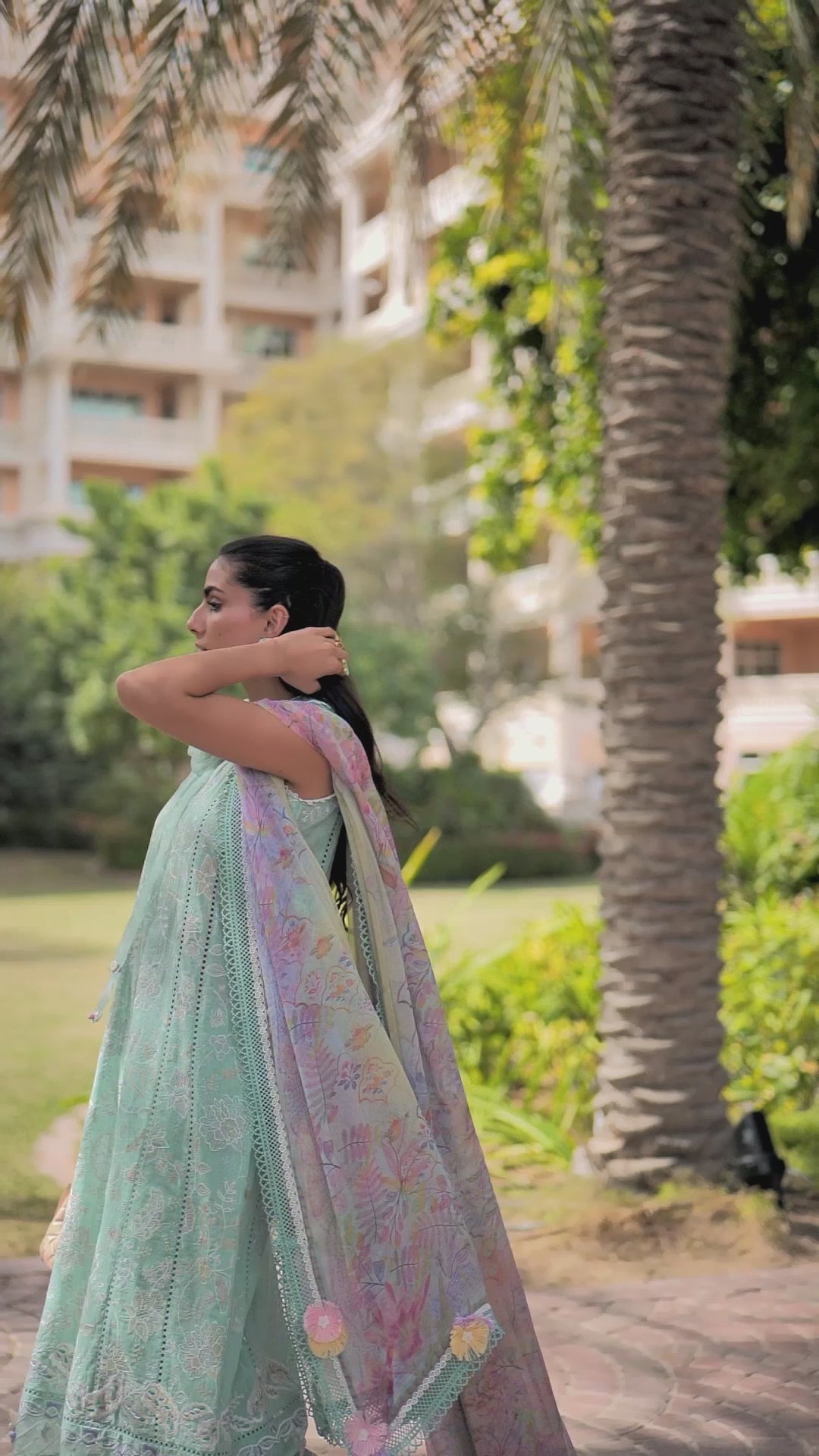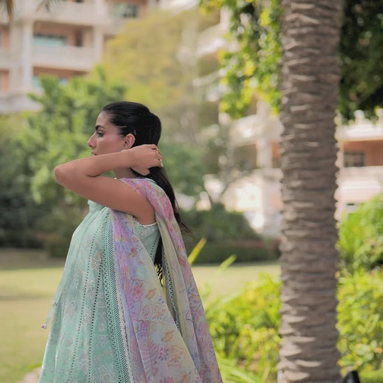 An exclusively designed soft PIMA lawn featuring ombré shadow work embroidery on the soothing captivating shade of pale aqua. Pre-Appliqued motif patches highlighted by kacha taanka paired with unconventional embroideries makes an undeniable statement. The comfortable, jacquard pants will keep you breezy day or night. The crown jewel of the outfit is the diaphanous Pure chiffon Dupatta in gorgeous soft pastel shades.