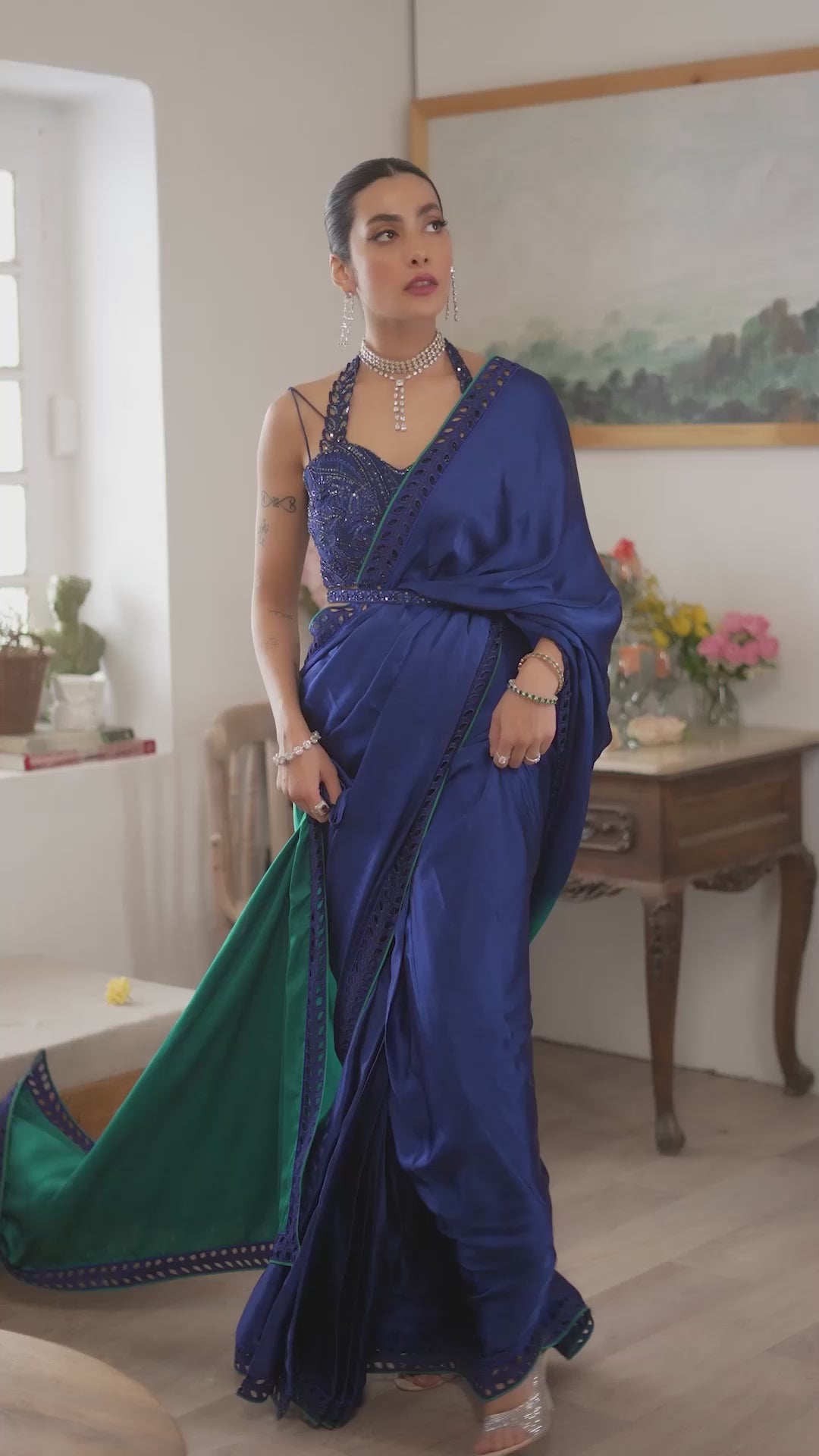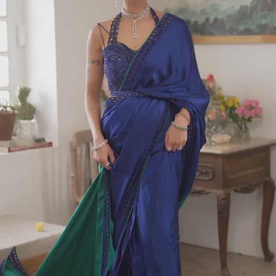 From a dinner to a wedding this understated saree does the trick to charm the crowd. The saree is paired with an impeccably tailored halter blouse, cut from pure Charmeuse fabric, with scalloped straps, richly hand-embroidered with an array of delicately shimmering Swarovski crystals, pearls and sequins on the front and back.