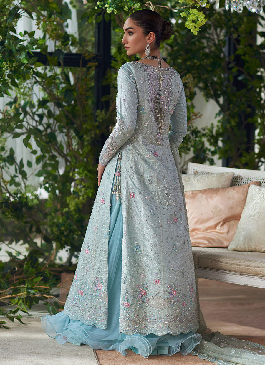Delicately hand-embroidered floral motifs trail along the front, adding depth and drama to the soft pastel base. Each element is carefully placed to create a look that’s both romantic and refined.
