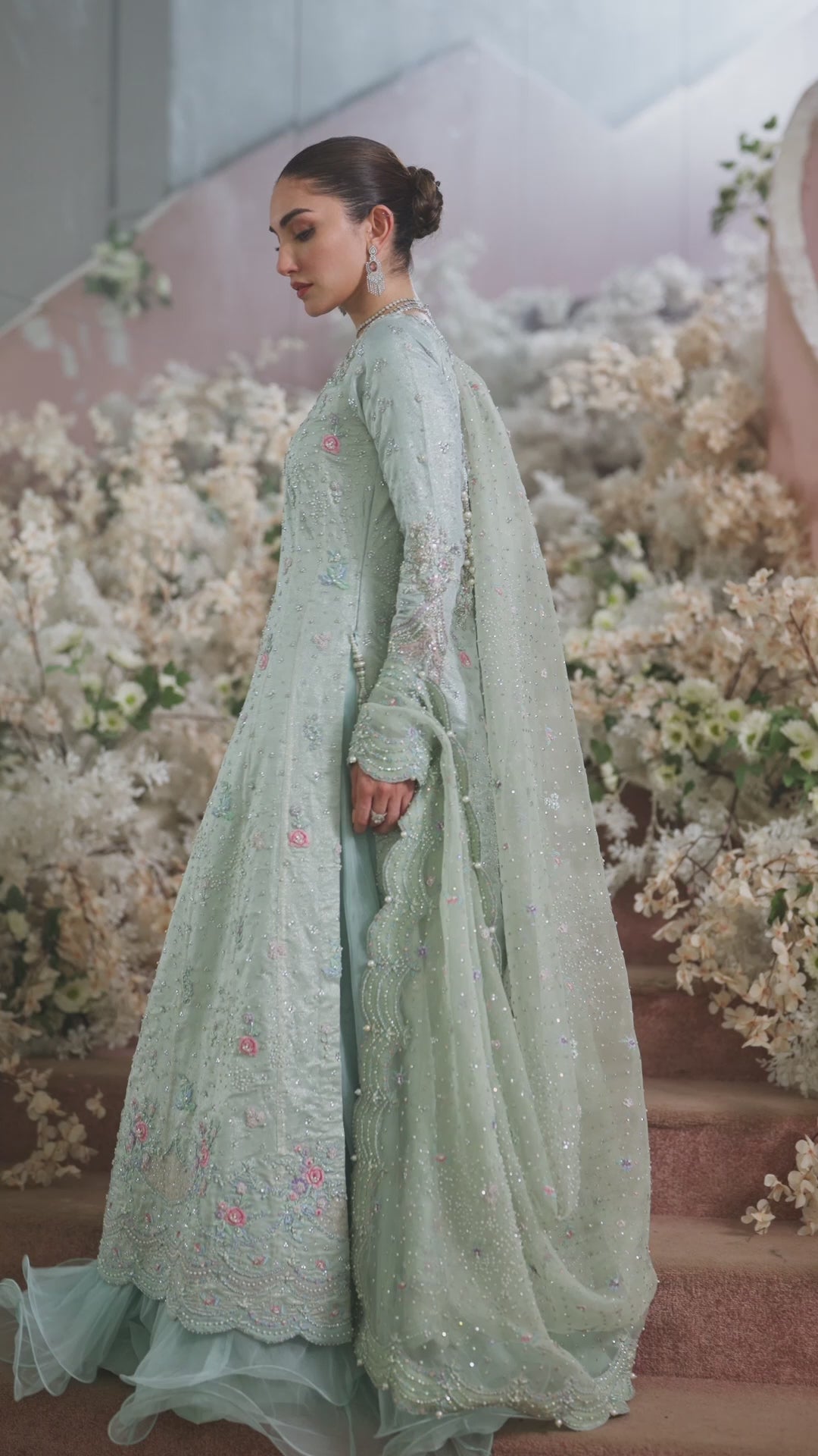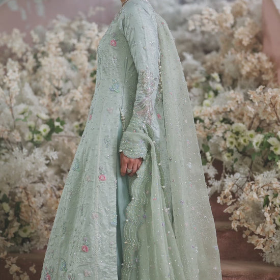 Graceful and timeless, this pale mint green kalidaar in rich zari silk is a perfect choice for year-round festivities. The silhouette features a beautifully rounded neckline, adorned with intricate handwork using silver kora, dabka, sequins, and Swarovski crystals — designed to catch the light and command attention with subtle sparkle.