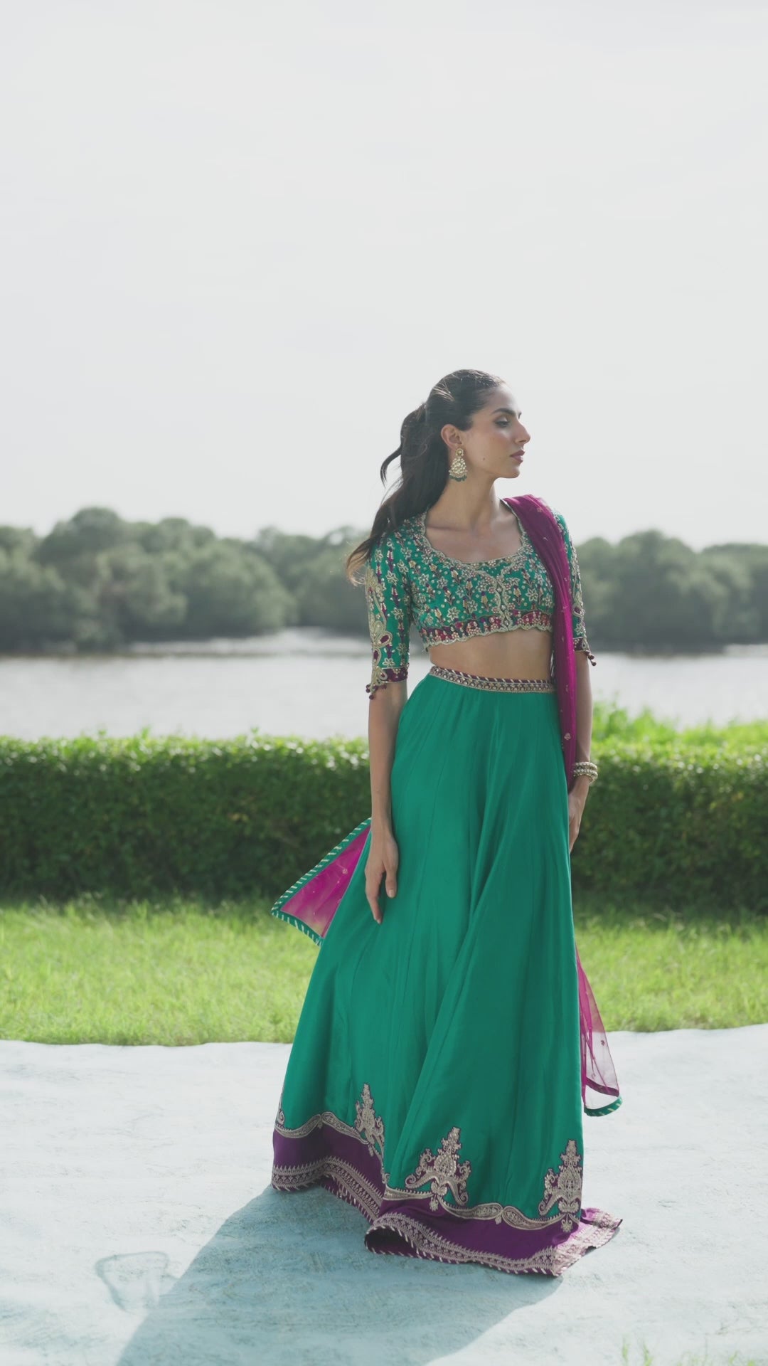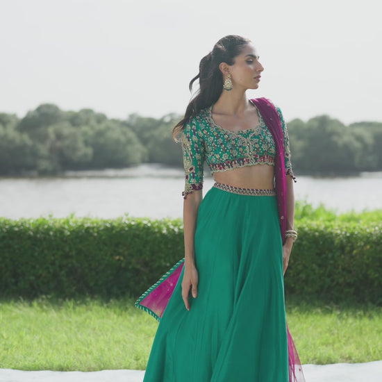 A vibrant ode to craftsmanship and color, this emerald and purple ensemble brings together traditional artistry with modern finesse. The block-printed choli shimmers with intricate handwork — kora, dabka, nakshi, resham, and crystals — creating a tapestry of texture and light. Paired with a delicately hand-embellished deep purple net dupatta and a graceful raw silk lehenga finished with subtle embroidery and playful tassels, this look is equal parts striking and sophisticated — made to dazzle at any festive celebration.