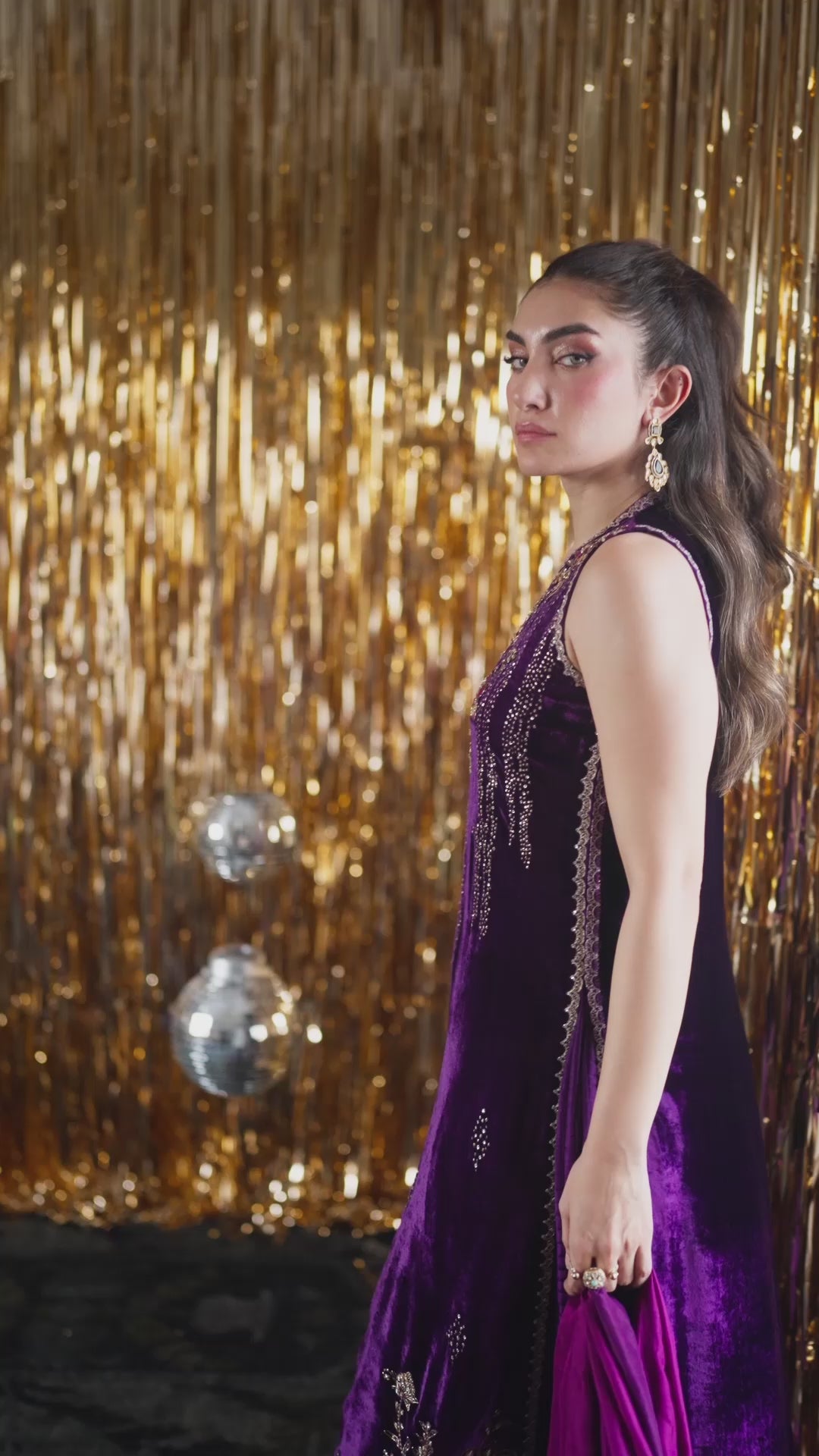 A love letter to understated opulence — this luxurious deep aubergine velvet ensemble is your obvious answer to eternal glamour. The long, front-open silhouette shimmers with exquisite hand embellishments in kora, dabka, nakshi, and tilla, while intricate appliqué work in tonal purple hues, adds texture and depth. Paired with a beautifully dyed pure medium silk dupatta and a matching raw silk izaar, this look radiates regal sophistication.