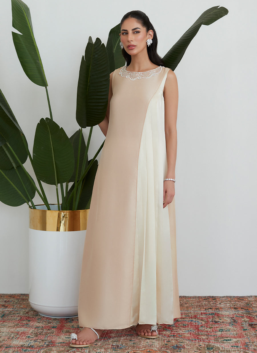 Cut from pure raw silk in a stunning sand and ivory colour palette, the outfit features a modern neckline and an uber flattering contemporary silhouette.