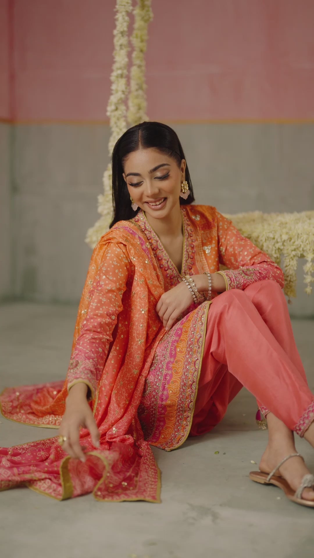 A celebration of bold glamour, this pure raw silk ensemble channels modern oomph with ease. The shirt and dupatta are given a stunning ombre treatment as a zingy tangerine hue flows smoothly into a charming watermelon hue.