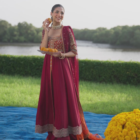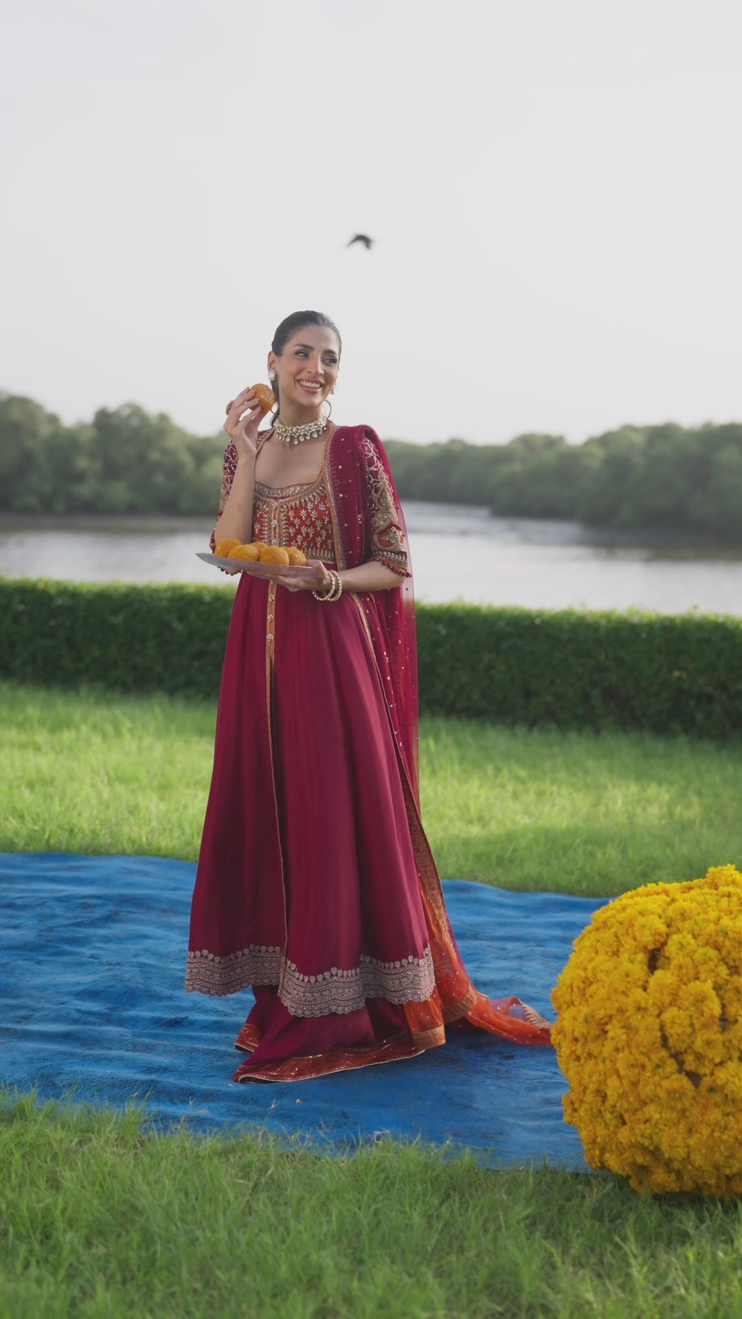 Drenched in rich maroon with flashes of burnt orange, this breathtaking raw silk Kalidhar is the epitome of timeless festive glamour. The front-open silhouette features a block-printed and intricately hand-embellished bodice — shimmering with kora, dabka, naqshi, tilla, and crystal work. Paired with a coordinating maroon dhaka in raw silk, touched with burnt orange accents, the ensemble captures opulent warmth and regal sophistication. The two-toned net dupatta — maroon and burnt orange — delicately scattered with sequins, adds the perfect finishing flourish of ethereal grace