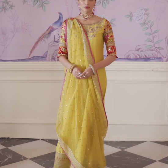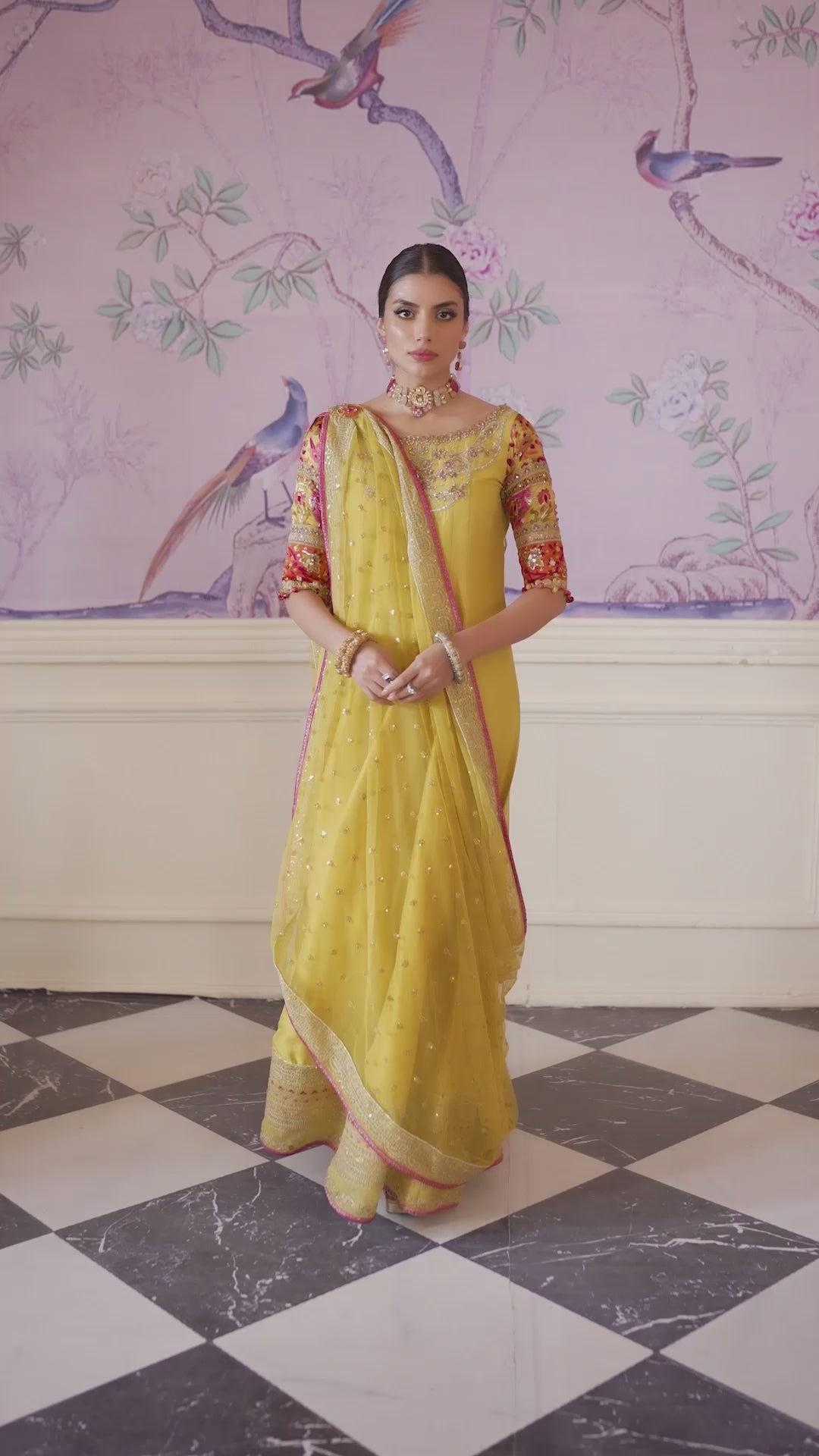 The round neckline and hand block printed sleeves are intricately hand worked with glimmering gold gota, nakshi, sequins and dabka. The kalis cascade down from the heavily neckline adding graceful movement and that unforgettable drama.