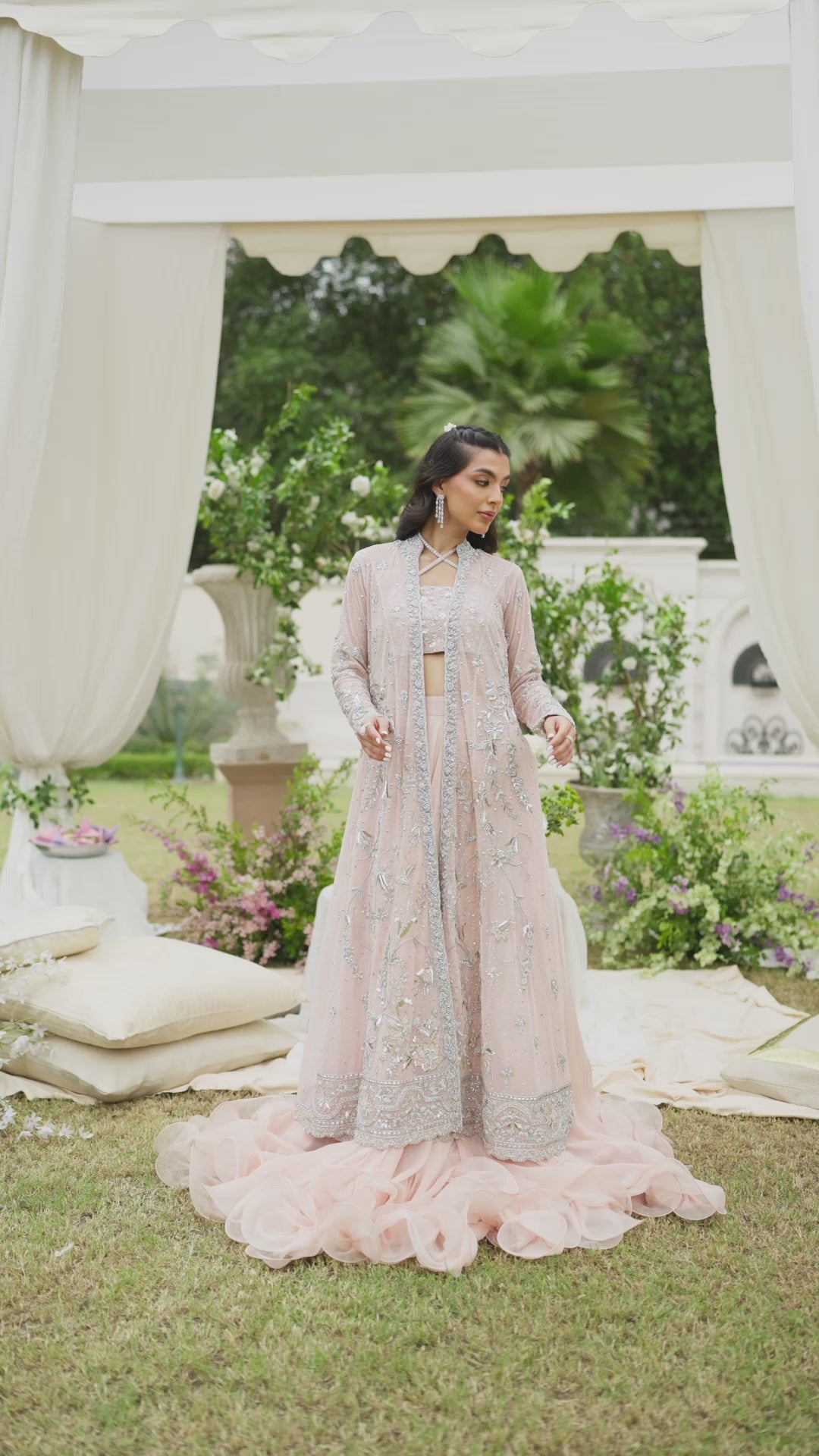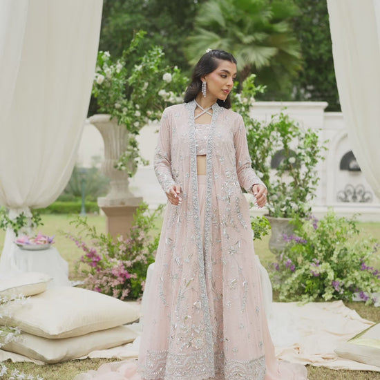 Soft and romantic, this pale blush ensemble captures the essence of modern elegance. The sheer net jacket shimmers with mukaish, kora dabka, sequins, and crystals, creating a play of light across its surface. Beneath, a zari silk bustier is delicately adorned with tiny zardozi florals, adding subtle intricacy. The 25-yard chiffon lehnga flows with ethereal ease, bringing volume and movement to the silhouette. A look that is airy yet opulent — perfect for celebrations that call for quietly stealing the spotlight