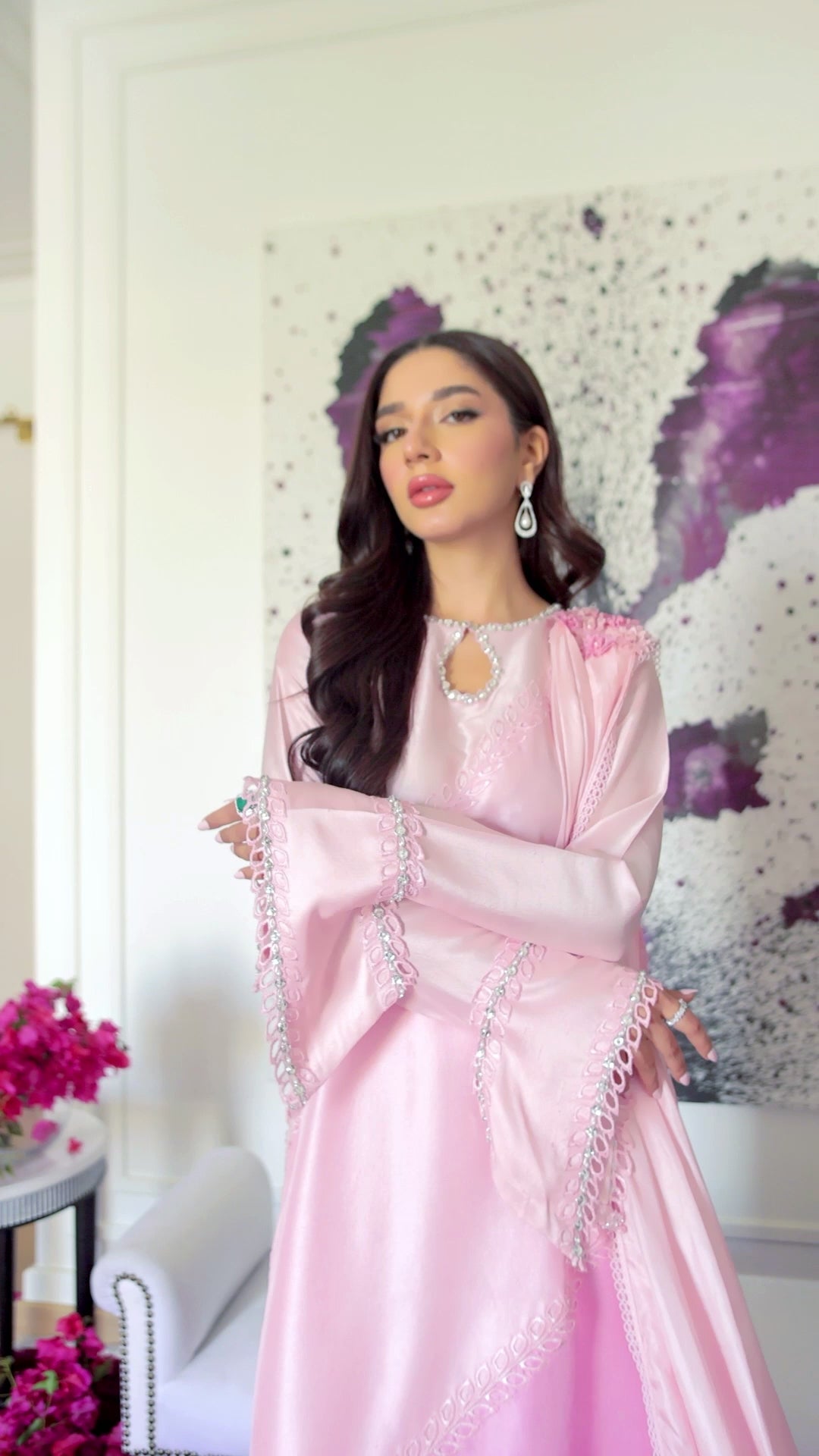 A refreshing culmination of pink hues come together in this delicate creation that is a must have for this spring season. The two-tone raw silk shirt features a hand embellished round neckline with keyhole detailing that is donned with pearls, sequences and hand worked leafy schiffli border that runs across the width of the shirt. The loose fit sleeves with an interesting French cut allows for a modern touch that is embodied throughout this gorgeous ensemble. It is paired with beautifully tailored loose white crepe pants and a medium silk two toned draped dupatta that flows effortlessly from one shade to the other and is finished with a lace detailing with whimsical organza ruffles.