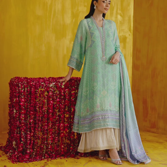 Playful yet refined — this digitally printed, pure raw silk kurta is brought to life with a richly embroidered neckline, hand worked sequins and zari for a striking finish. Refreshing pale aqua chunri print, offset with the softest periwinkle hue make this a must have. Delicate gota detailing adds eye catching interest to its traditional silhouette. A printed silk dupatta completes your ensemble. Pair yours with our impeccably pure raw silk crushed pants to strike the perfect balance between elegance and festivity.