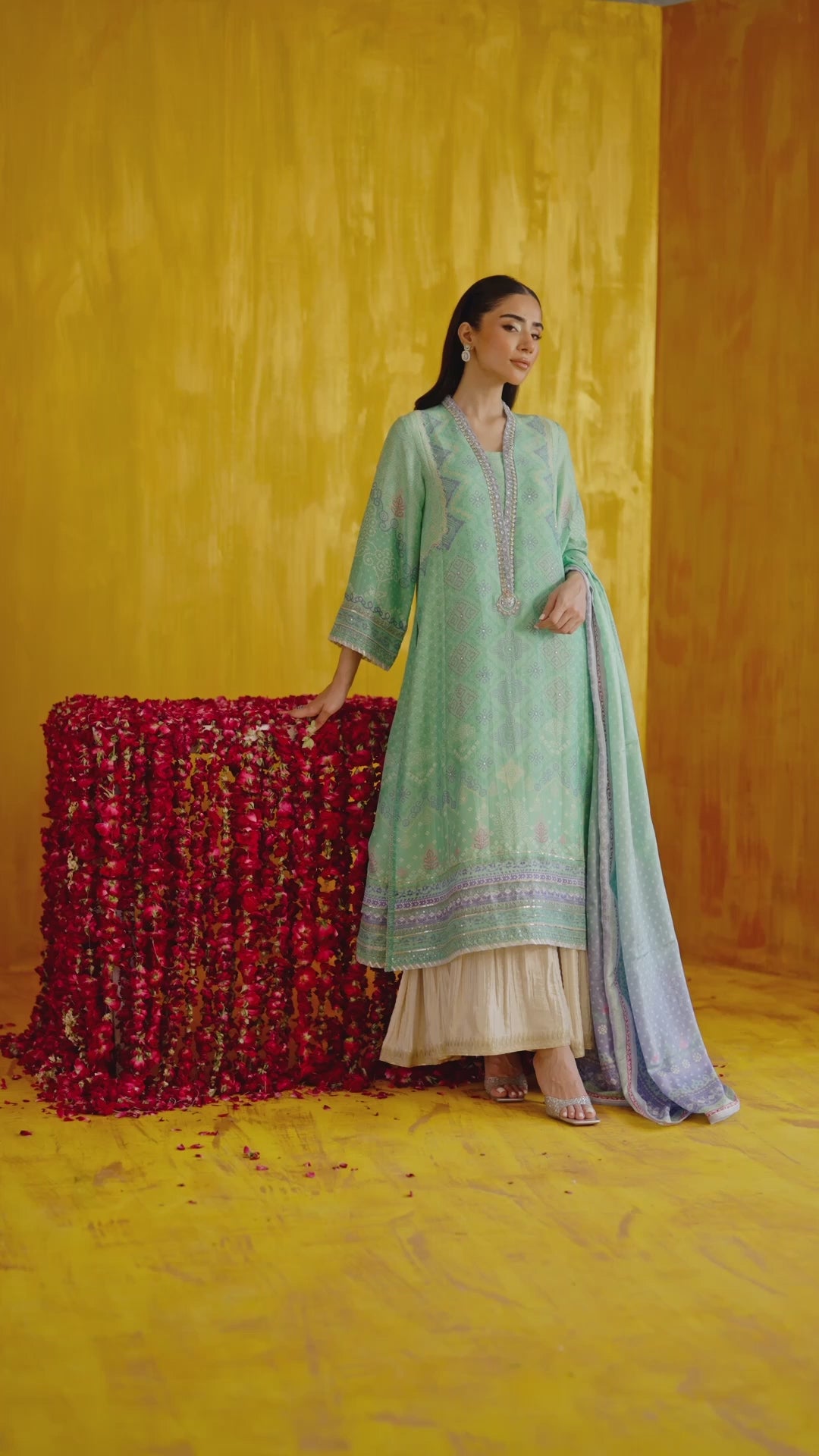 • Classic printed kurta with ornate embellishments, paired with a sleek izaar and a printed dupatta