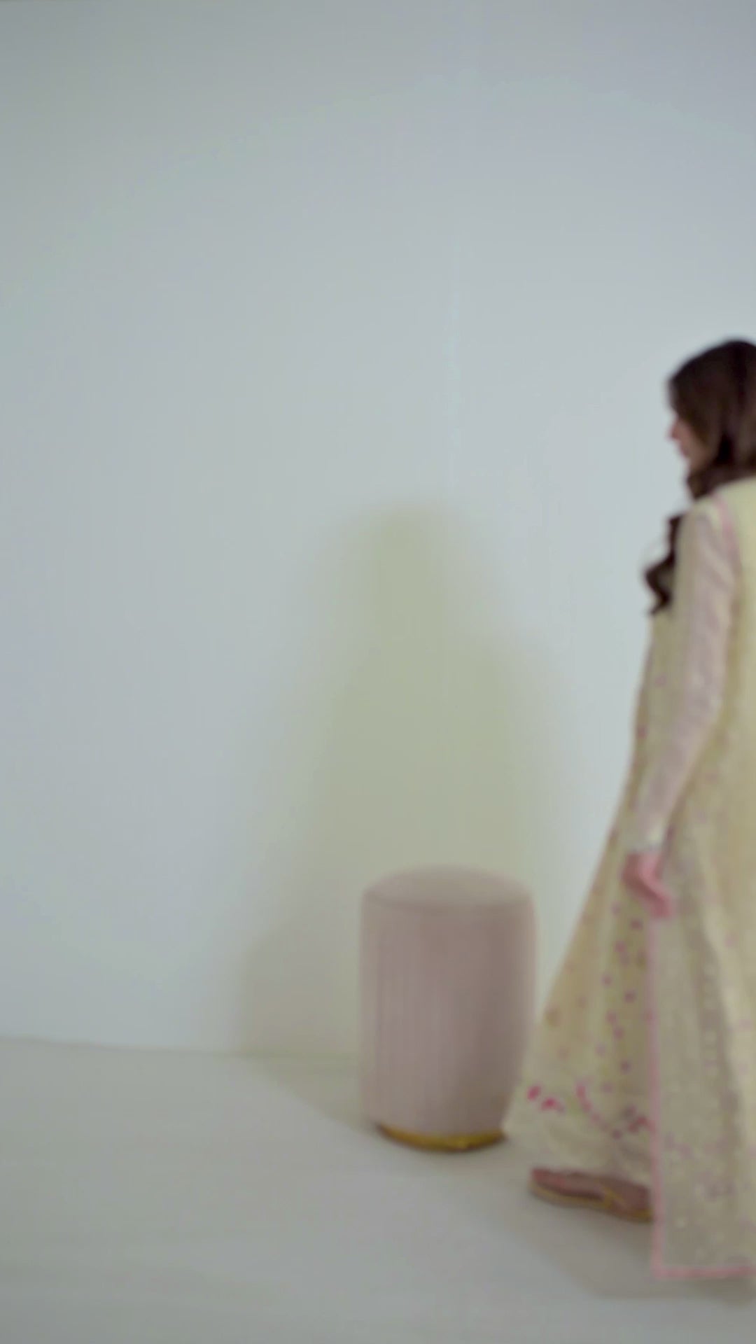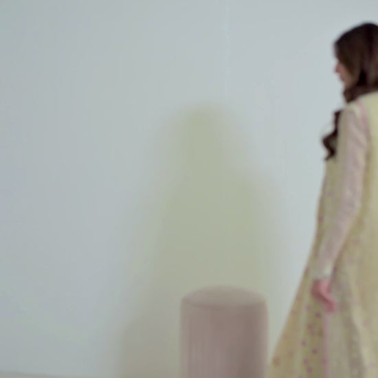 A soft play of textures defines this ivory raw silk kalidar, with embroidered organza sleeves and an intricately handworked, pearl-studded neckline. The hem carries an embroidered border for subtle structure, while a sheer organza dupatta with pearl and Swarovski crystal embellishments adds delicate sparkle. Paired with a raw silk izaar, the look is graceful, modern, and endlessly versatile.