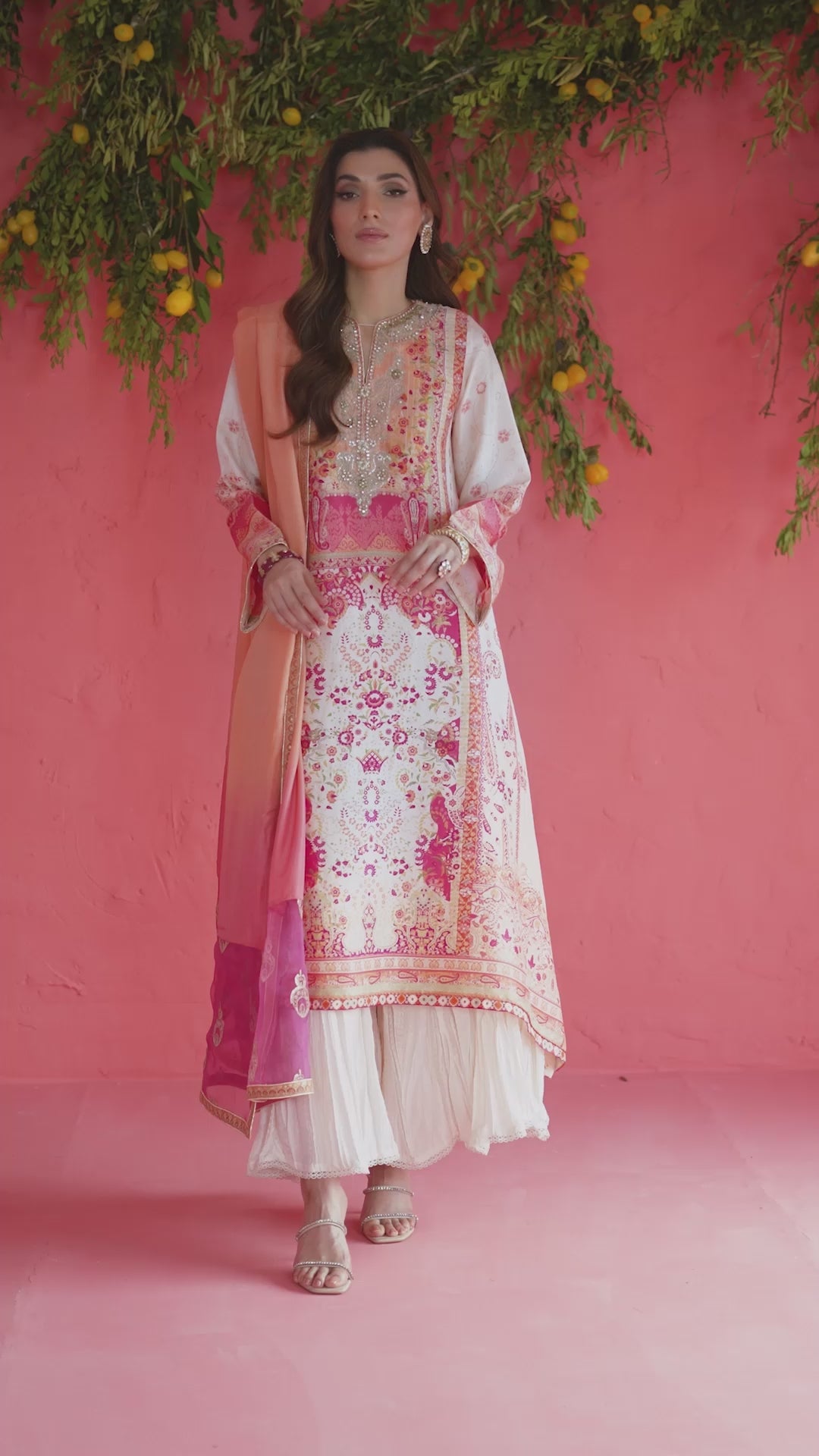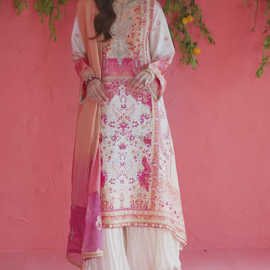 The gorgeous two-tone, pure medium silk dupatta with gota trimmings adds a graceful flair to your outfit.