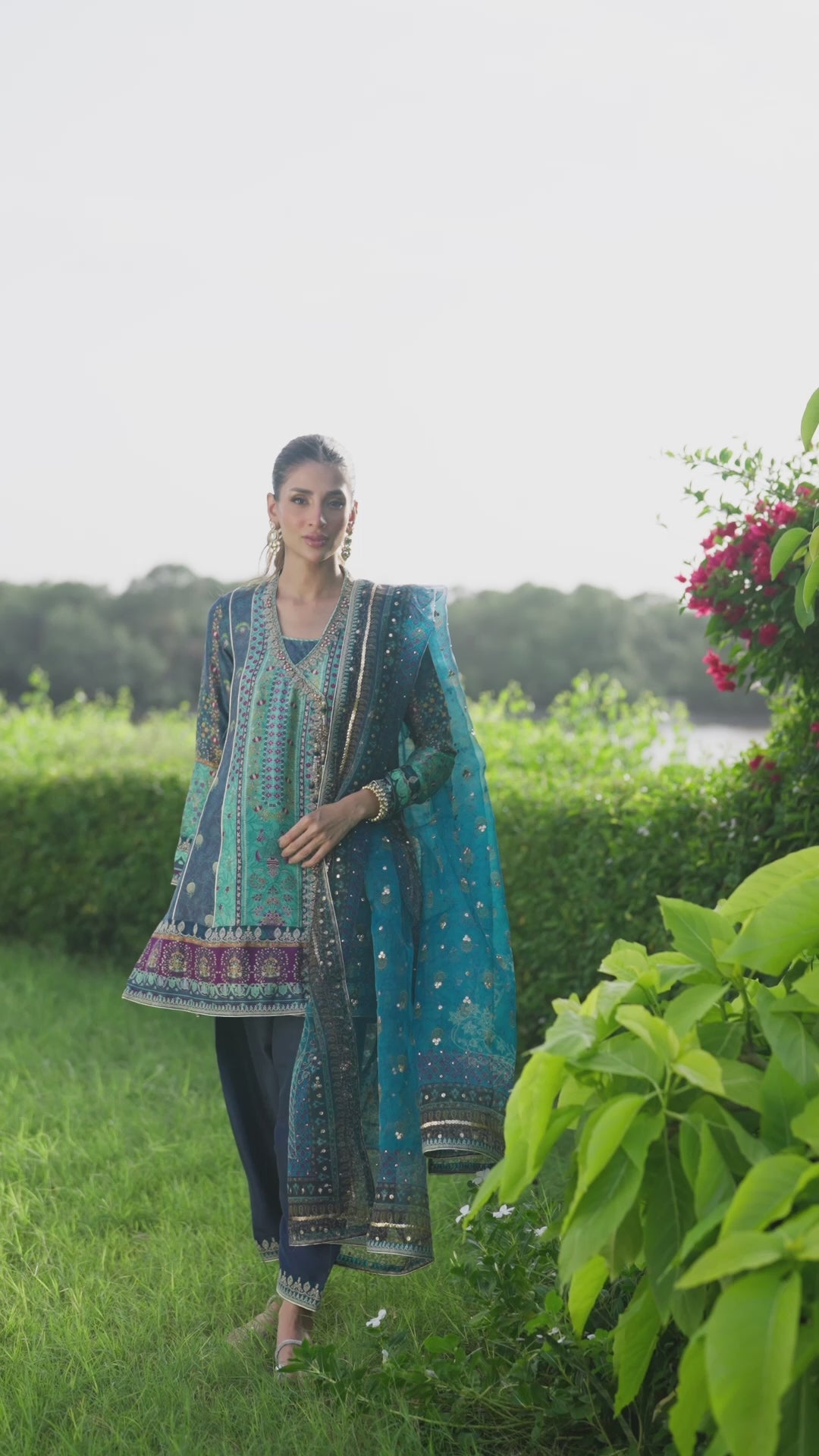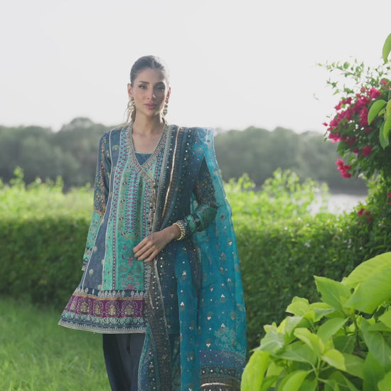 Turn up the glamour with this striking ink blue and teal ensemble — a seamless blend of tradition and contemporary allure. Cut from pure raw silk, the silhouette is designed to flatter effortlessly, featuring a thigh-skimming wrap top that cinches loosely at the waist for a beautifully feminine shape. Intricately hand-embellished with sequins, gota, and aari work, this piece radiates festive opulence. The tapered pure raw silk shalwar balances the drama with refined sophistication, making it an eternal favorite for every celebration.
