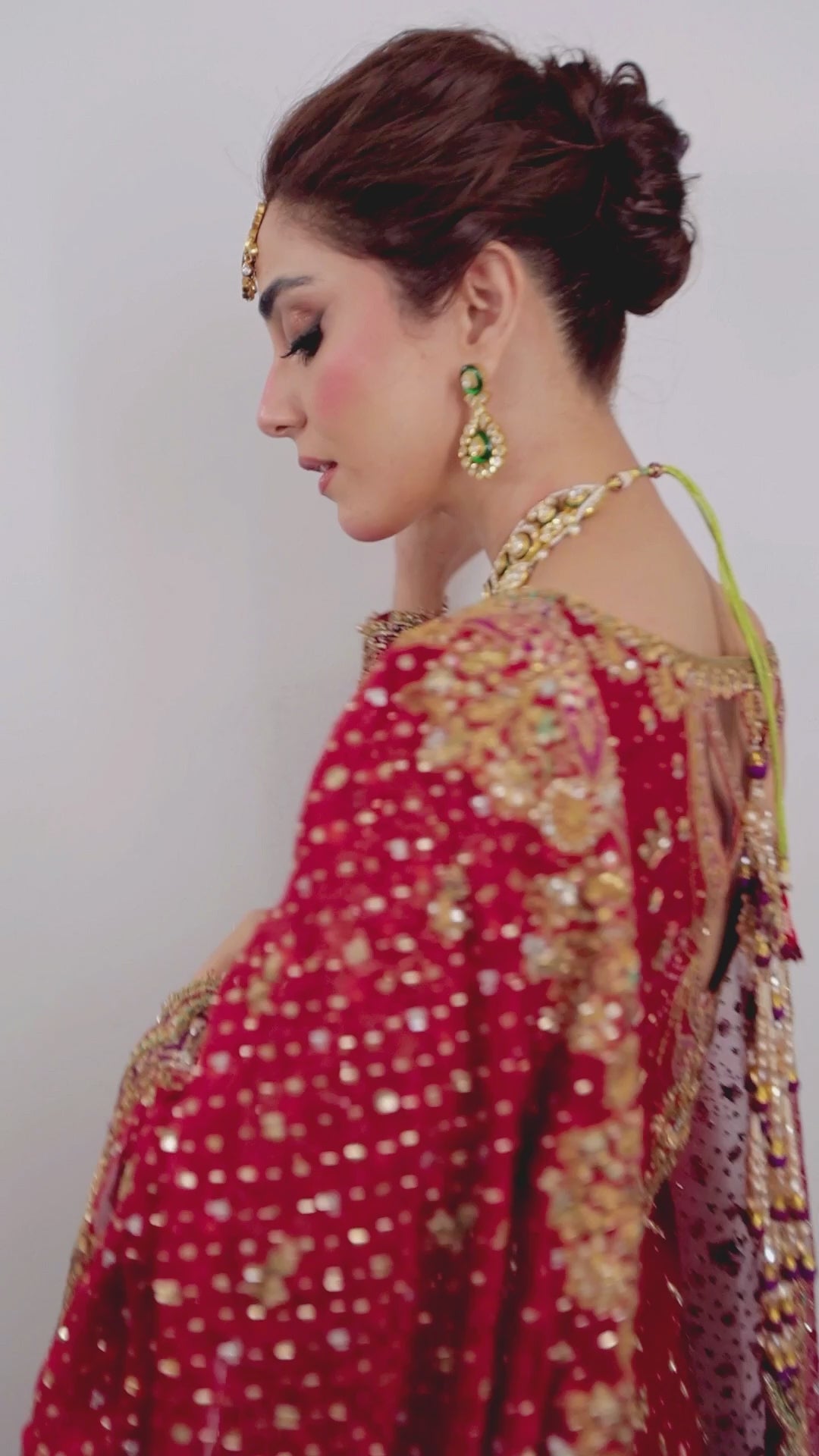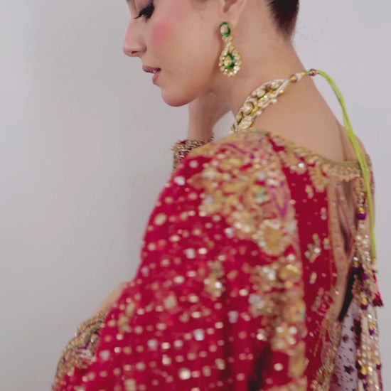 The meticulously selected unique shade of scarlet is the bridal color of the season. The voluminous straight shirt that has a wide heavily embellished daaman comes with high slits and ultimately makes it the most flattering silhouette for a bride. The pure cotton net shirt is beautifully embellished with intricate gold zardozi, dabka, sequins, and silver zari, naqshi, gota. Heavy on the traditional mukesh and kamdani this look is truly the one that will stand out this season. It has a heavy floral trellis on the front and back which gives the bride regal feels. This elegant shirt is complemented with a farshi lengha made in gold jamawar with heavily worked shades of royal purple pure raw silk for the goth. The lehenga in pure jamawar is embellished with delicate and beautiful gold handwork done by our expert artisans. The exceptionally beautiful bridal is an absolute showstopper. The dupatta features a heavily intricate border which gives the dress a fancy finish that will no doubt leave everyone amazed. The perfect combination of colors makes it a unique outfit which will give the bride a gorgeously royal look.