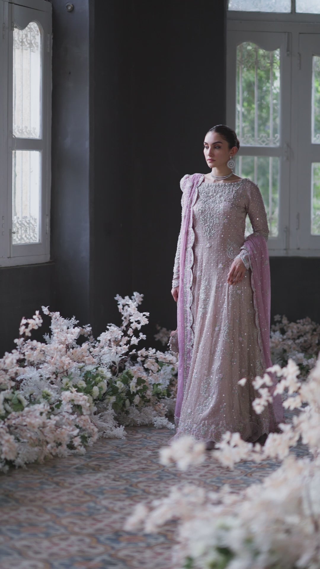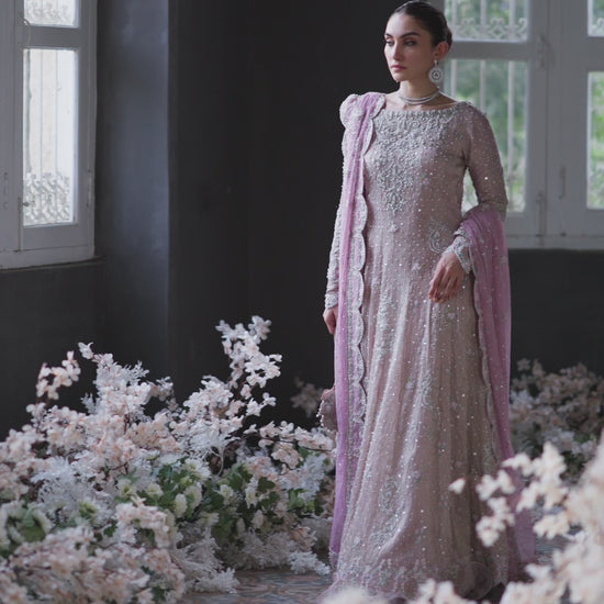 Grace meets grandeur in this ethereal pale lilac kalidar, crafted from pure zari silk for a luminous, flowing drape. Hand-embellished with intricate silver-toned detailing — including pearls, Swarovski crystals, kora, dabka, and naqshi — this piece is a celebration of artisanal excellence. Delicate resham embroidery in soft hues of light blue, green, lilac, and blush pink breathes life into the floral motifs, adding a gentle burst of color to the shimmering surface.