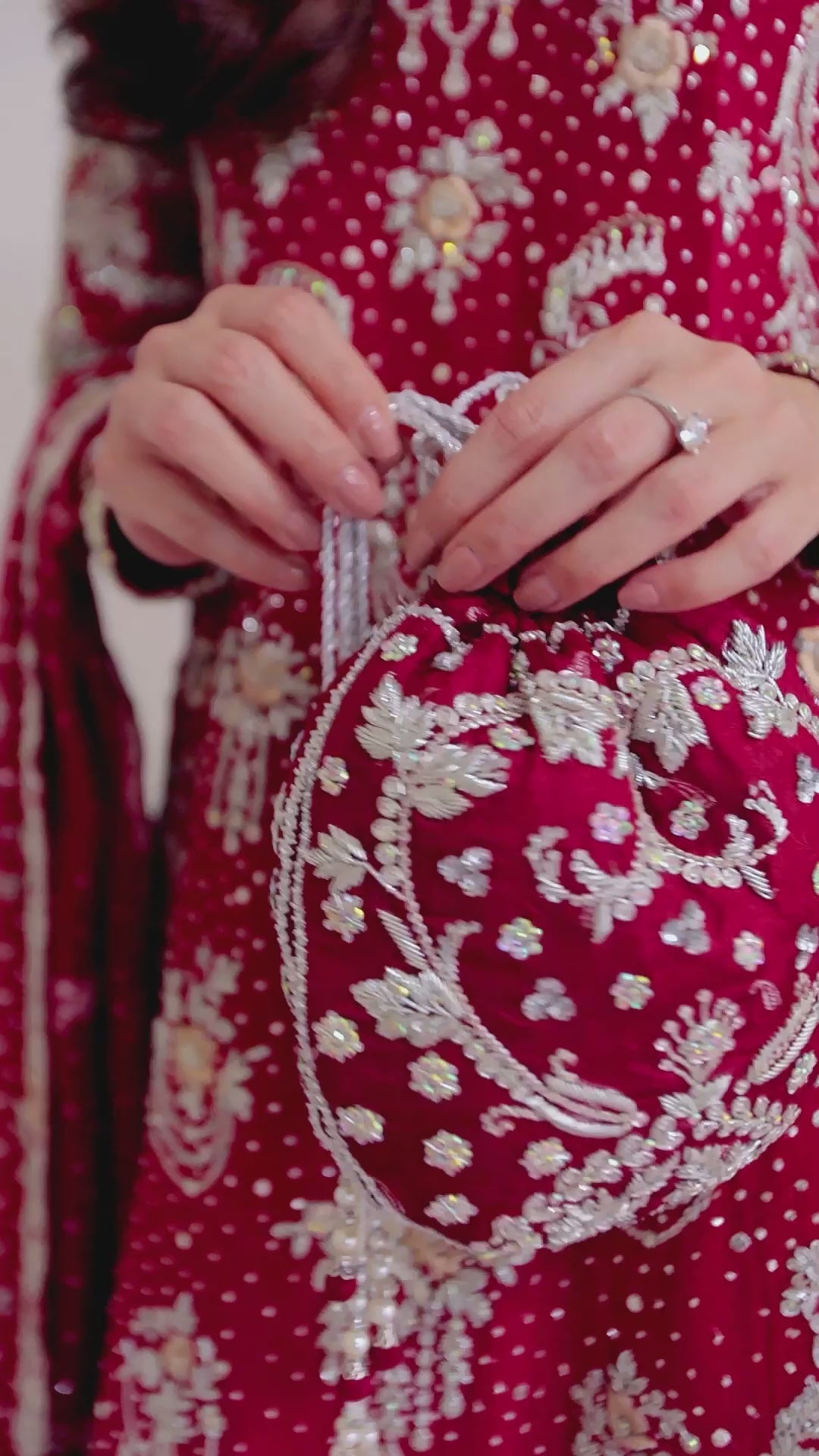 This FTA Red bridal is a stunning heritage ensemble. This meticulously picked deep-red pure cotton-net beauty is emblazoned with intricate silver naqshi, kora, dabka and Swarovski crystals. The one-of-a-kind traditional hand embellishment has this stunning piece sparkling flawlessly this season.