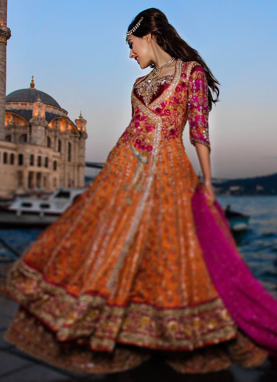 Orange long angrakha with heavy embroidery and zaari work. The sleeves and neckline are fully worked in exquisite detail. Paired with a border worked flair lehnga and makesh dupatta, this outfit is an eclectic mix of colors.