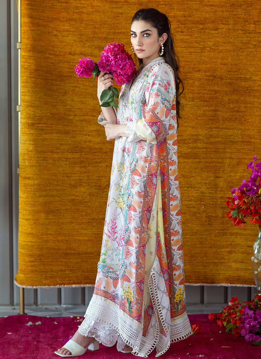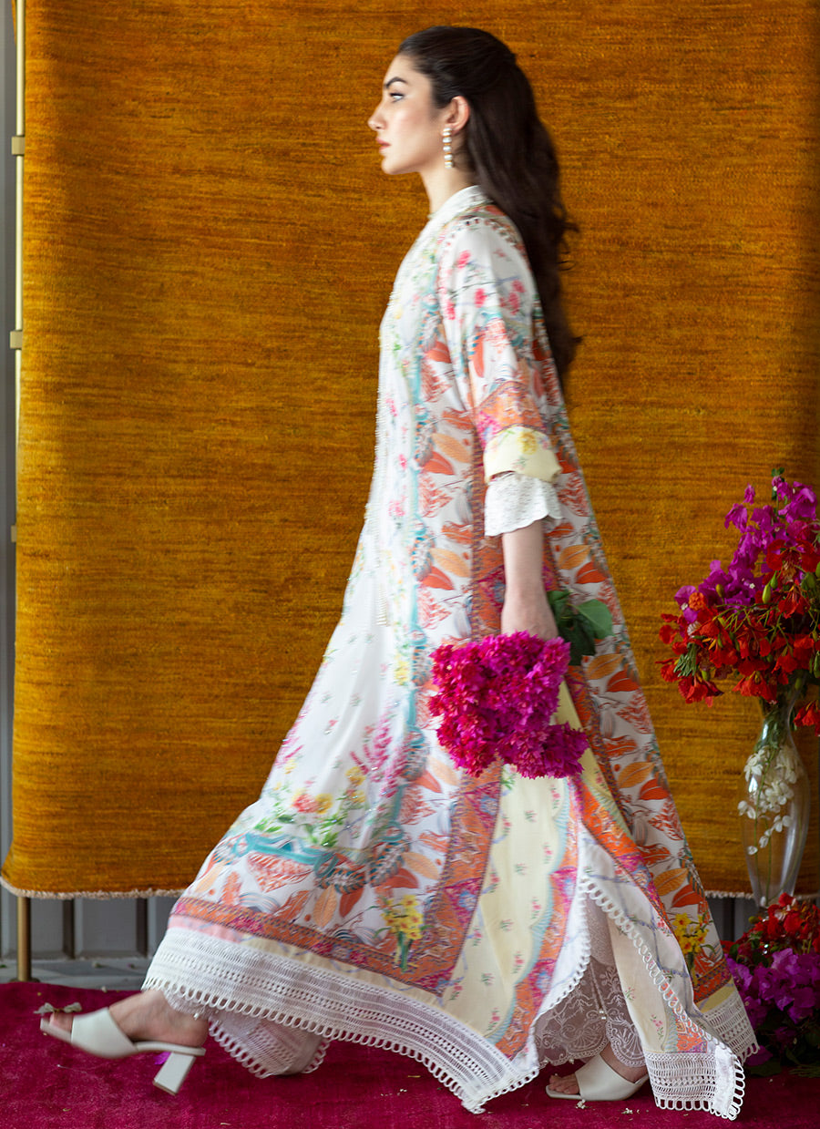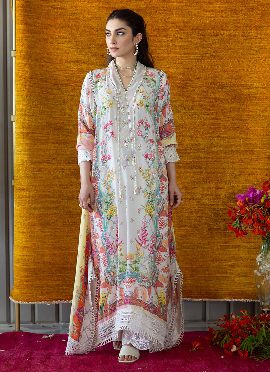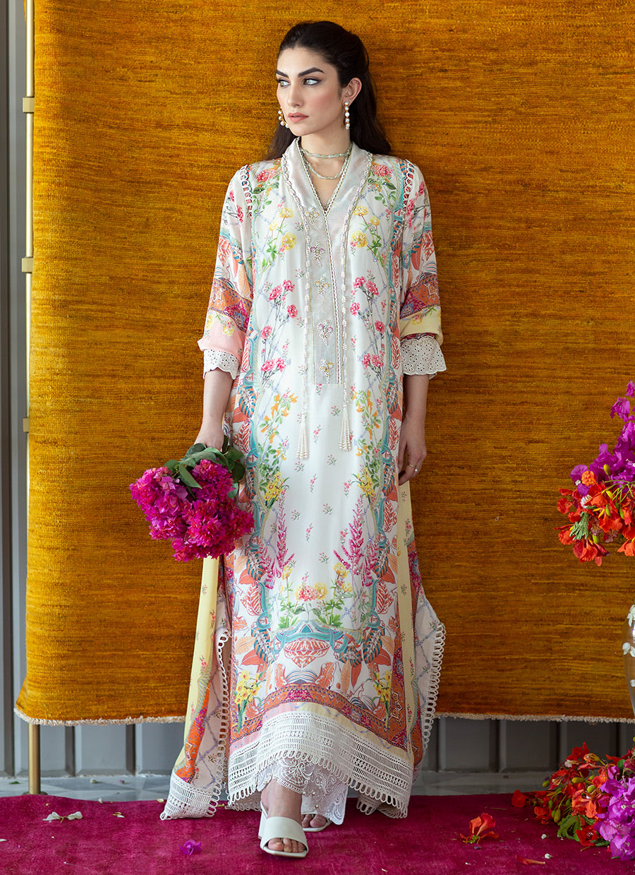 Designed in-house at the FTA Studio in Karachi, each of our printed tunics is created with extreme attention to detail. Cut from pure Crepe Silk this pristine ivory tunic is boldly emblazoned with stunning blooms in a myriad of colours. A universally flattering, relaxed silhouette is further enhanced by statement sleeves with delicate schiffli borders. Hand embellished with embroidered flowers and pearls, this easy breezy tunic is sure to be your go-to this festive season. Finish off your ensemble with our culottes (as shown in the picture) to have heads turning no matter where you go.