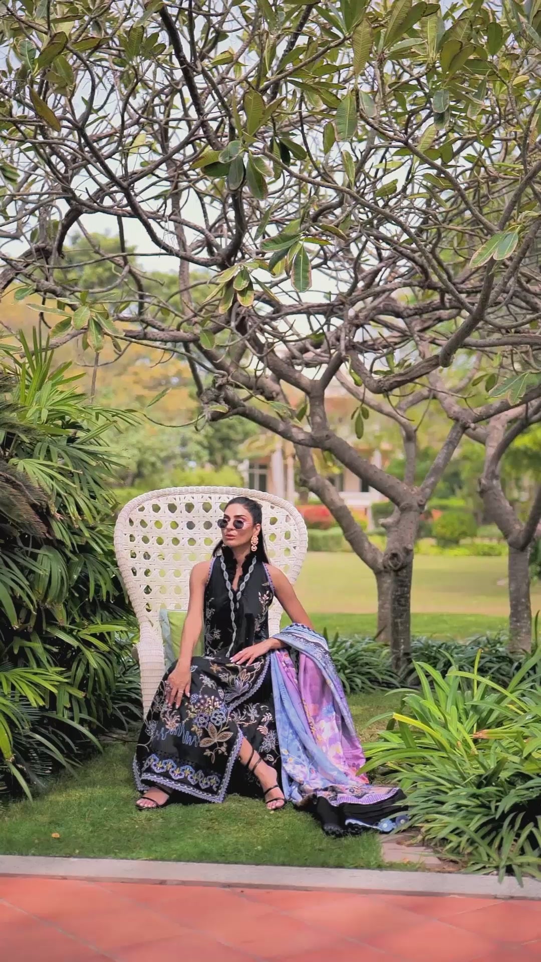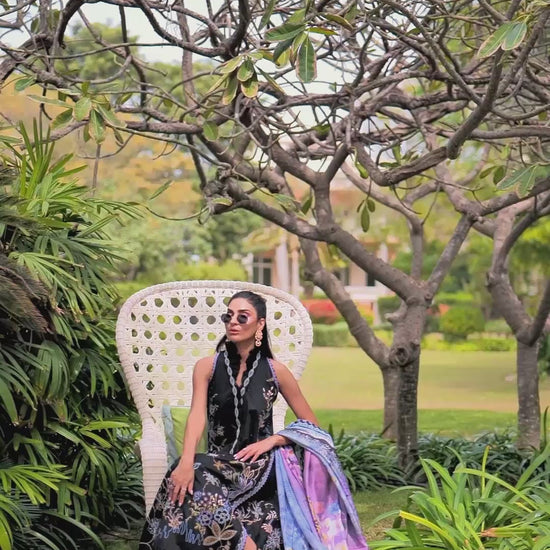 Belle Black is a striking ensemble, the shirt is decorated with impeccably embroidered blooms in enticing blue and lavender hues. The eye-catching embroidery on the sleeves and borders ties in with the stunning pure medium silk dupatta in soothing, refreshing colours ties the whole ensemble together with easy, covetable sophistication. Unexpected details, uncomplicated elegance with the must have Belle Black!!