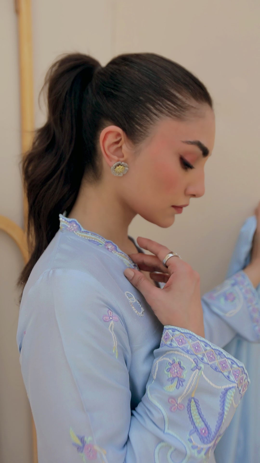 A refreshing shade of cornflower blue raw silk with signature FTA detailing is the ultimate must have for this spring. The relaxed, much loved silhouette has a universally flattering neckline, is gorgeously hand worked with pearls, sequins. The entire shirt is adorned with delicate embroidery is cool tones with gorgeous embroidered sleeves.