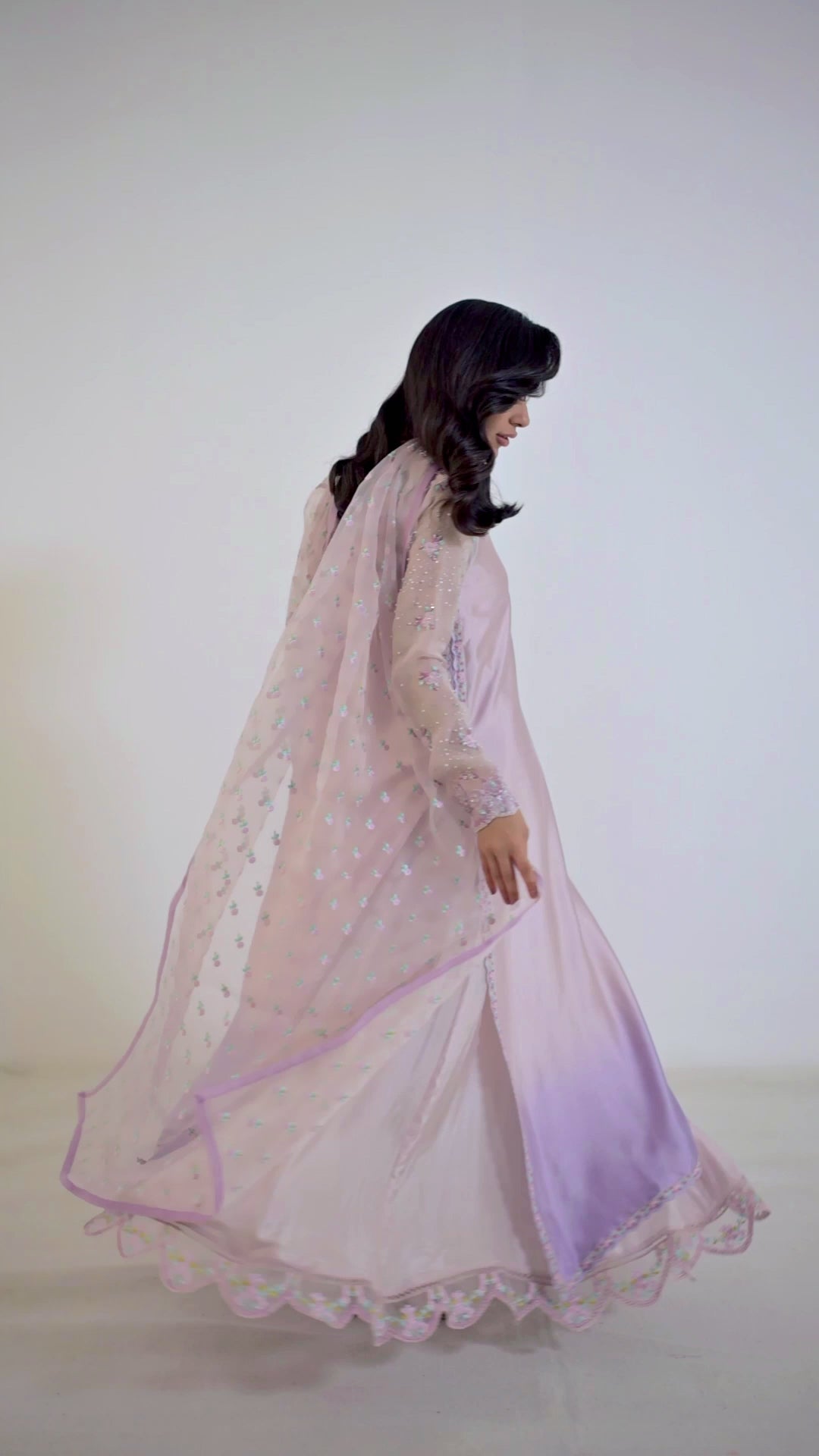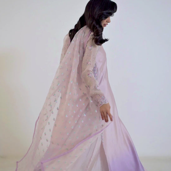 A vision in pale, silvery lavender that deepens into a rich tonal hue, adorned with composed silver and pearl embroidery. Delicate florals trace the neckline, while sleek organza sleeves shimmer with scattered sequins. Paired with an ethereal organza dupatta finished with intricate borders, this ensemble is eternally stylish, refined, and brimming with irresistible details.