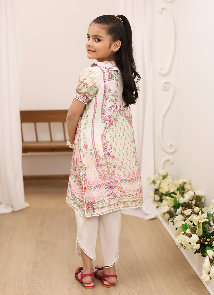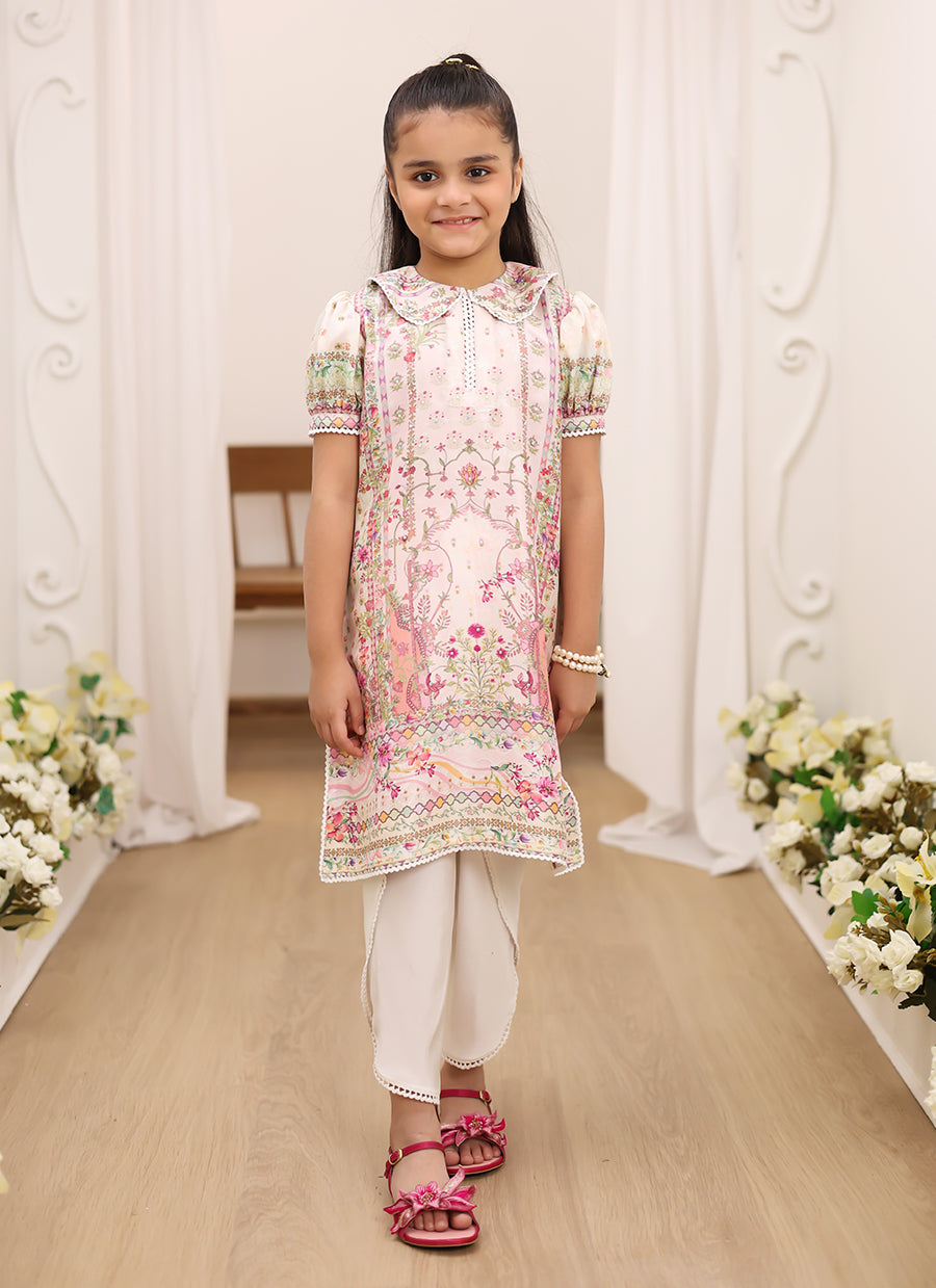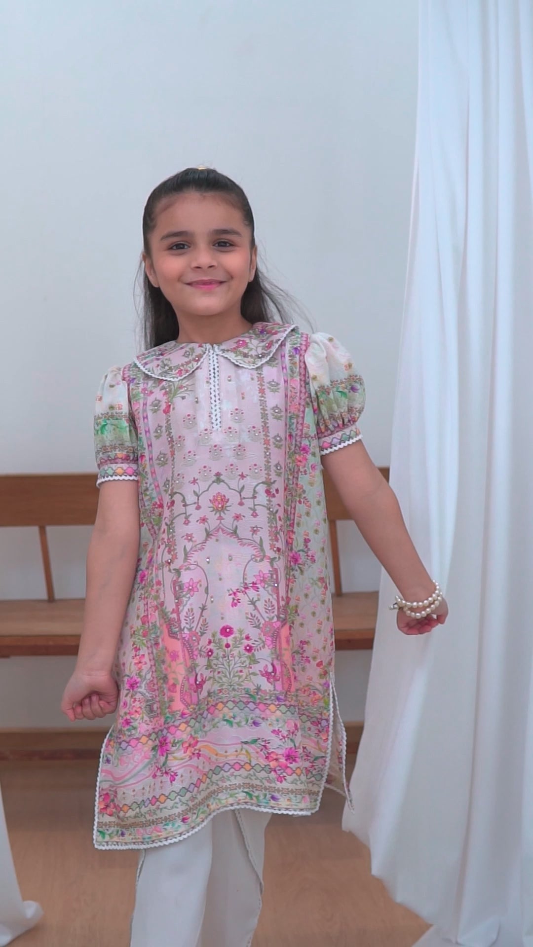 This sumptuous raw silk kurta for young girls is a stunning blend of elegance and whimsy. The shirt is printed with whimsical florals that bloom daintily all over the shirt, making this an absolute must have. The sleeves are finished with stunning embroidery