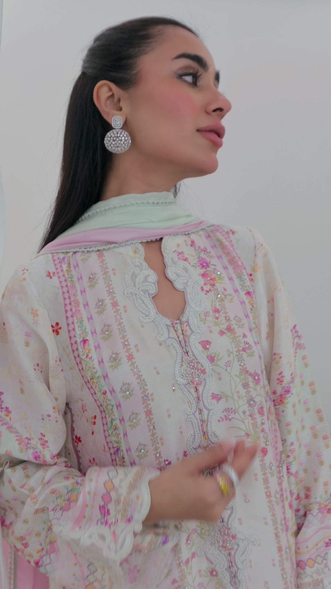Cut from sumptuous raw silk, the shirt is printed with whimsical florals that bloom daintily all over the shirt, making this an absolute must have. The relaxed, much loved silhouette has a universally flattering neckline, adorned with delicate hand-made floral motifs, pearls and sequins, adds an easy timeless elegance. The sleeves are finished with stunning embroidery. The graceful, relaxed fit shirt is paired with a pure medium silk dupatta in coordinating ivory and blush pink trimmed with organza borders embroidered with vibrant blooms. Pair yours with pure raw silk pants as pictured