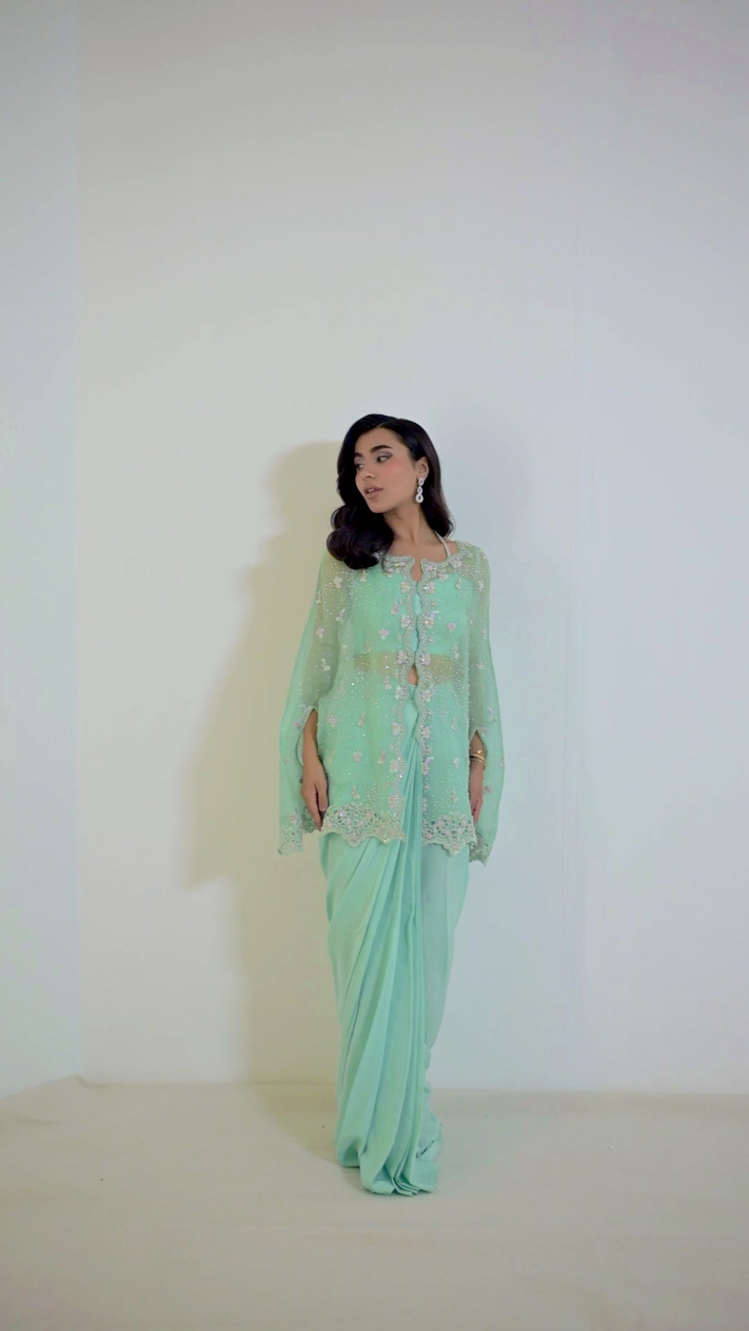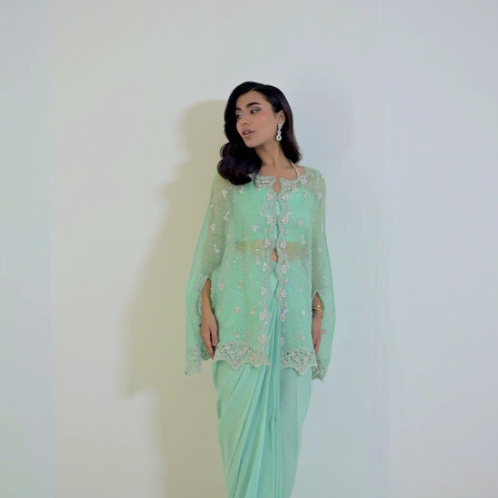 An airy organza cape, in a soothing aqua hue, embroidered with delicate schiffli and pastel accents, drapes gracefully over a hand-worked raw silk bustier. Completing your ensemble is a stunning pre-draped skirt. Modern, feminine, and styled for the guest who redefines elegance with ease