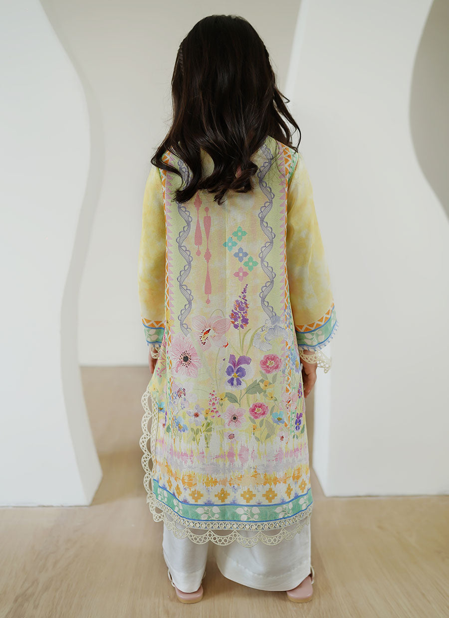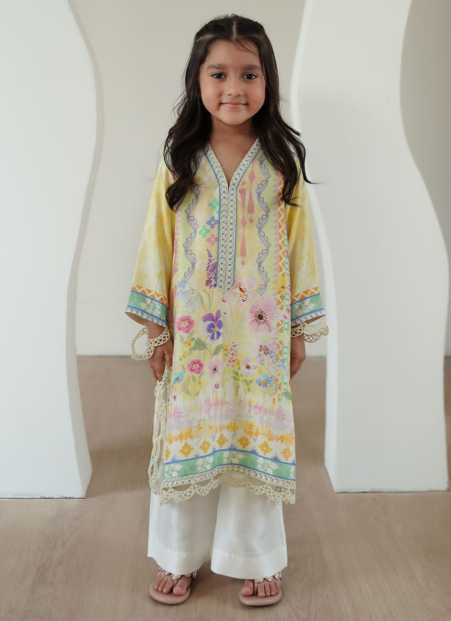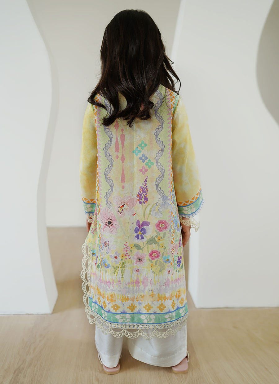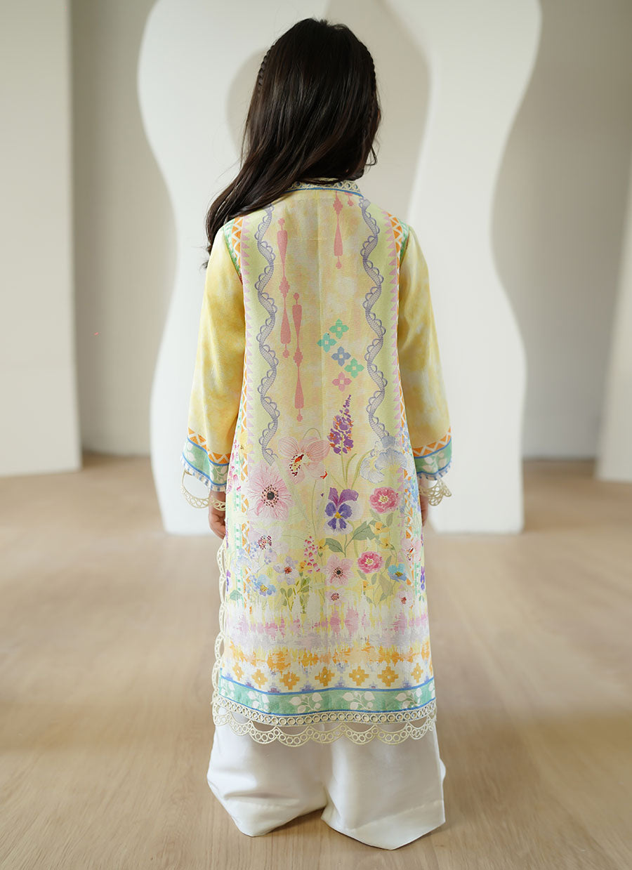 FTA’s signature prints return this festive season in a refreshing palette, reimagined with the house’s unmistakable flair for feminine elegance and effortless charm. Crafted from pure raw silk, this soft lemon yellow kurta for young girls is adorned with delicate floral motifs in pastel hues, evoking a sense of romance and innocence. The gentle contrast of pale lemon and soft lavender adds a playful yet refined touch, while the intricate print lends an air of timeless beauty. Designed with a flattering, easy silhouette, the kurta features subtle pleating and delicate finishing that enhance its graceful appeal. Paired with matching trousers, this ensemble is a beautiful blend of comfort and style—perfect for weddings, festive gatherings, and all the special moments in between, where your little one can shine with quiet confidence and charm.