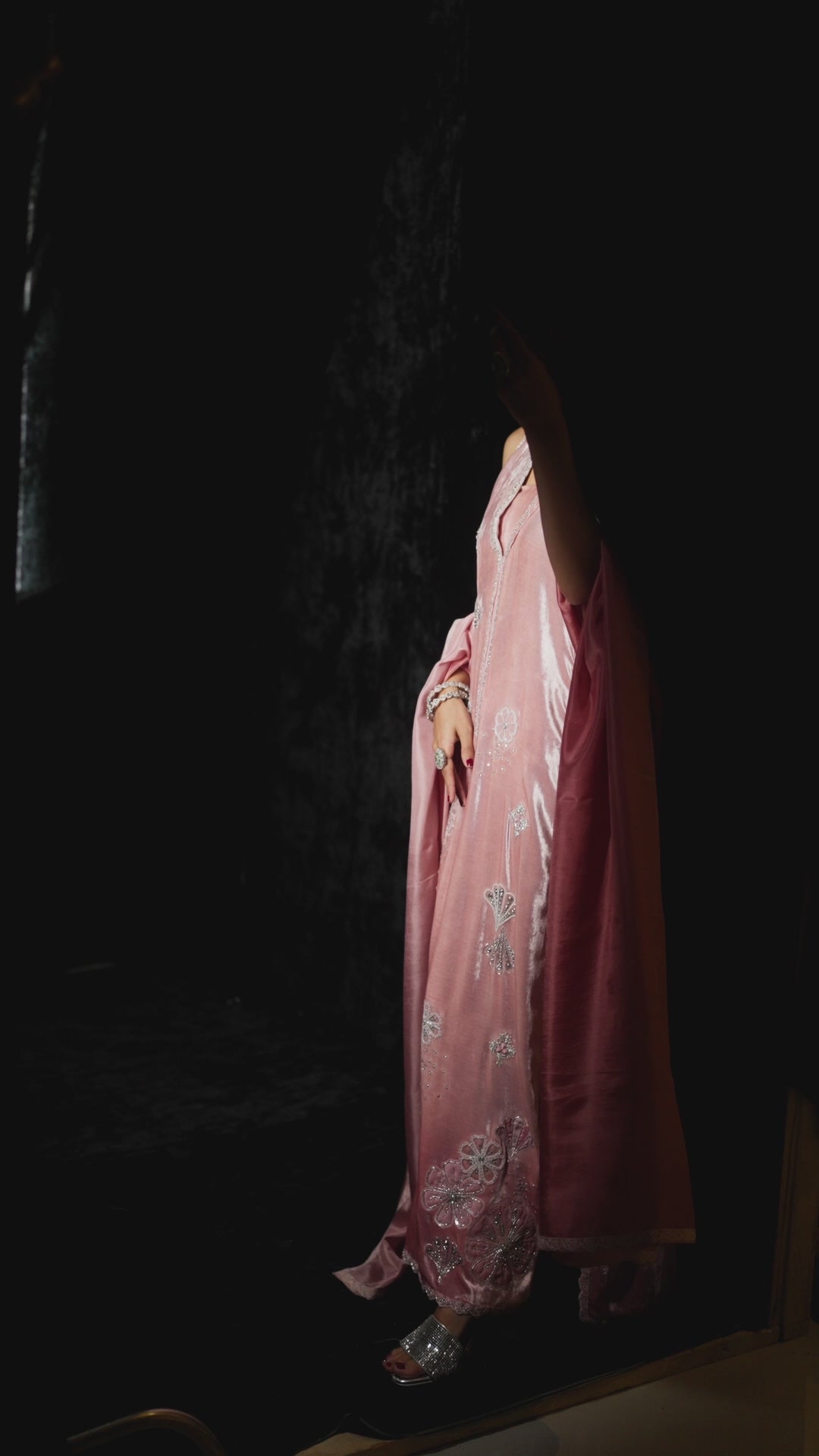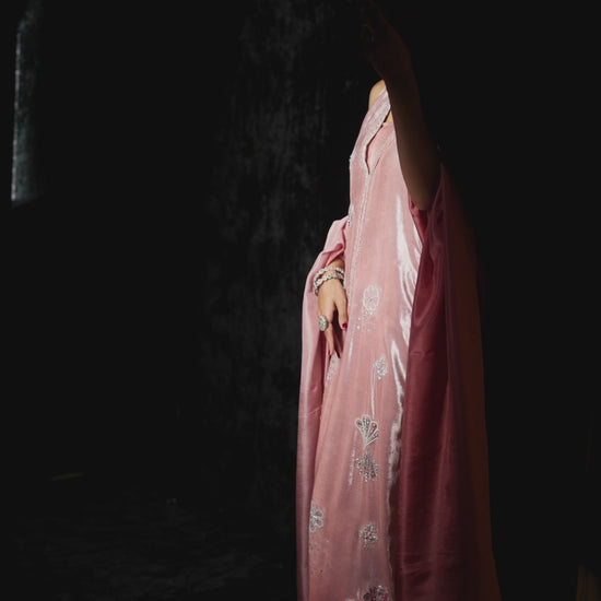 The straight long shirt, cut from plush velvet that transitions seamlessly from pale misty rose pink to delicate blush, is adorned with intricate appliqué embroidery and exquisite hand embellishments of kora, dabka, crystals, sequins, and pearls. The luminous craftsmanship adds depth and texture, catching the light with every movement. Paired with a tonal medium silk dupatta in dreamy pink hues and a pure raw silk izaar, this look is the epitome of festive refinement — timeless, feminine, and utterly captivating.