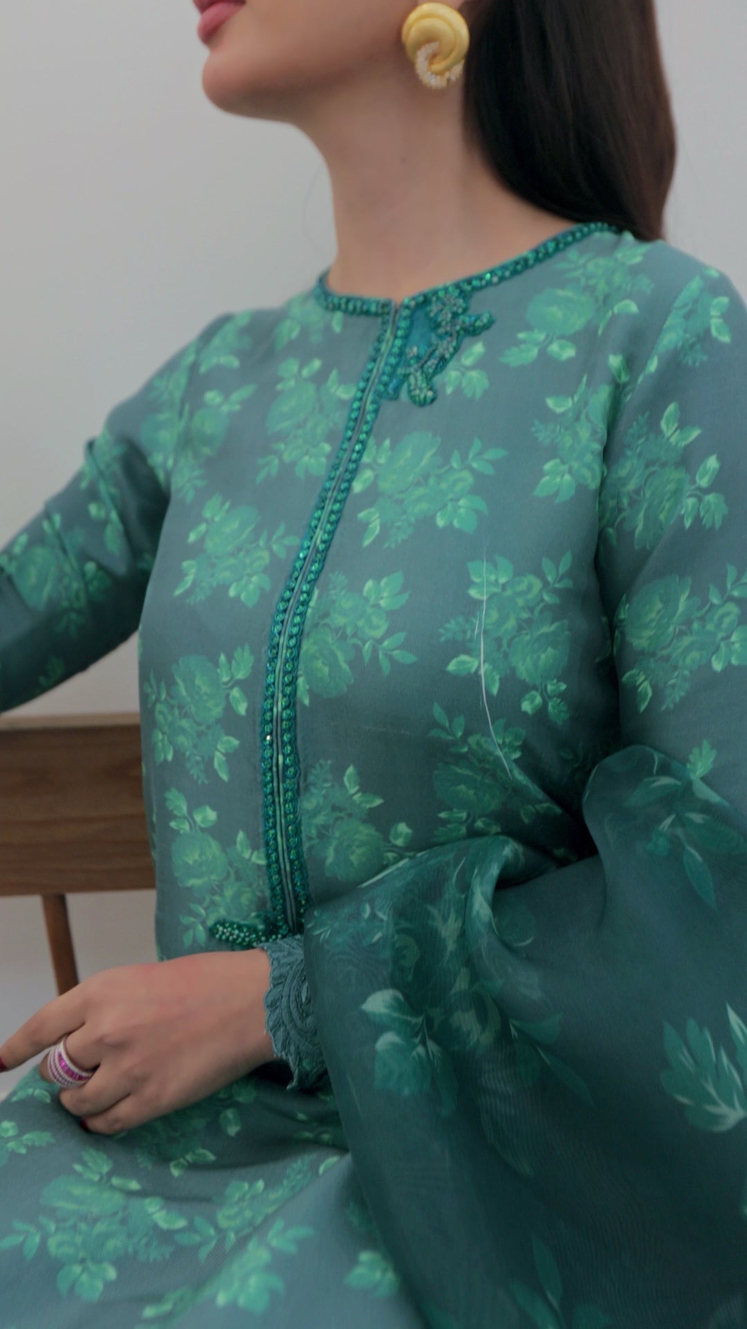 A dreamy organza dupatta completes the ensemble with stunning flair.