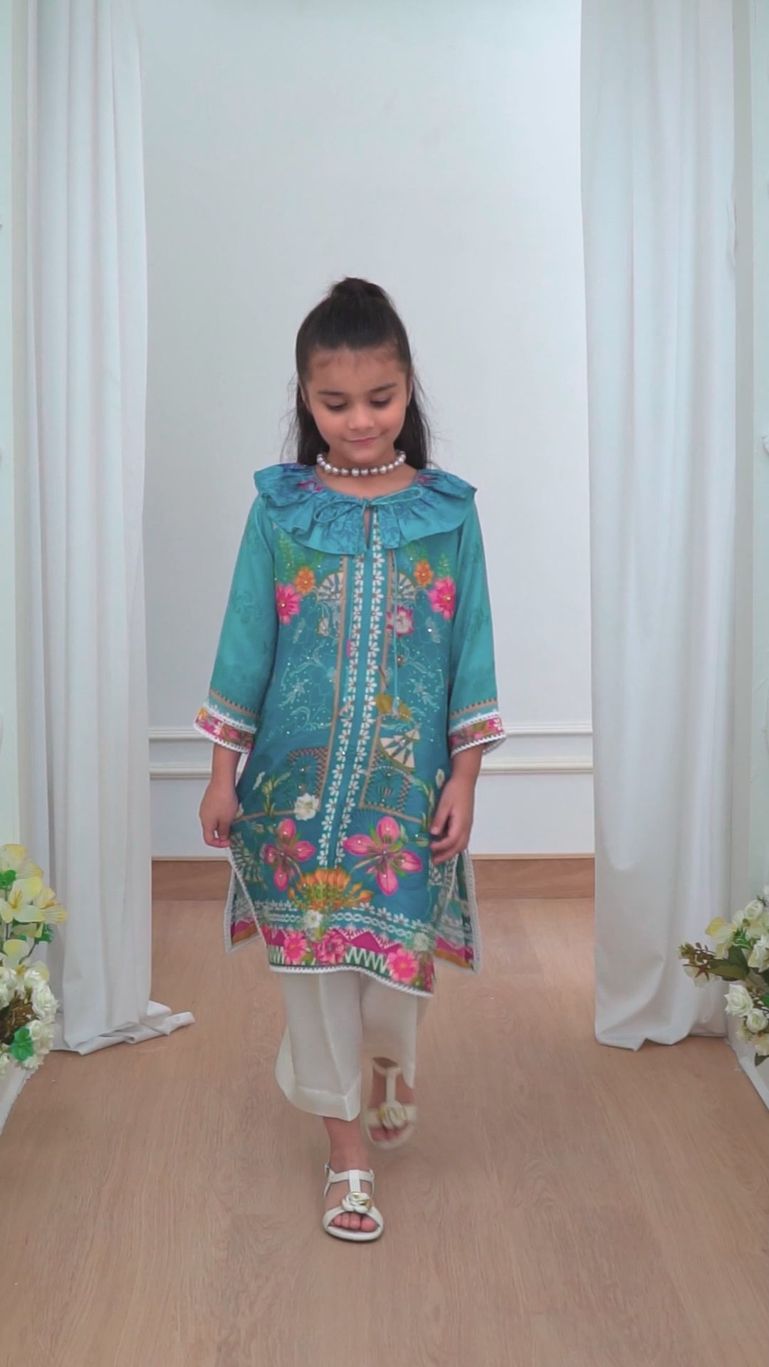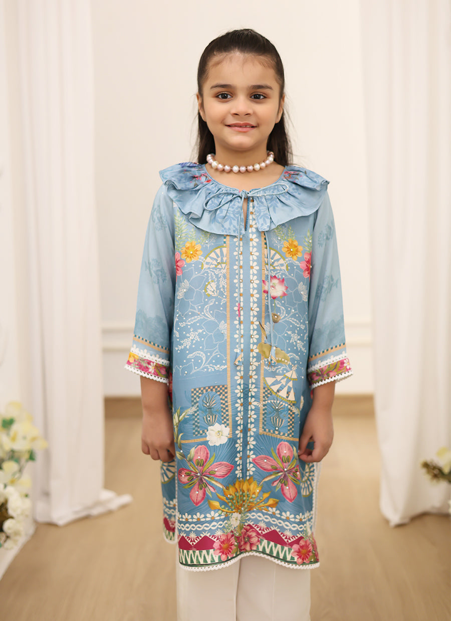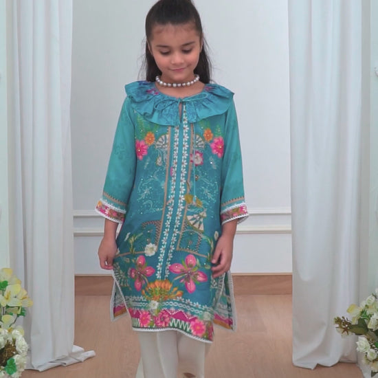 This slate blue printed raw silk kurta for young girls is a stunning blend of elegance and whimsy. The rich slate blue fabric is beautifully adorned with a delicate, subtle print, creating a sophisticated yet playful look. The kurta is highlighted by a striking puffy collar that adds a touch of drama and youthful charm, giving the outfit an elevated, fashion-forward feel. With its comfortable, relaxed fit and delicate detailing, this kurta is both a stylish and practical choice for any young FTA girl who loves to shine.