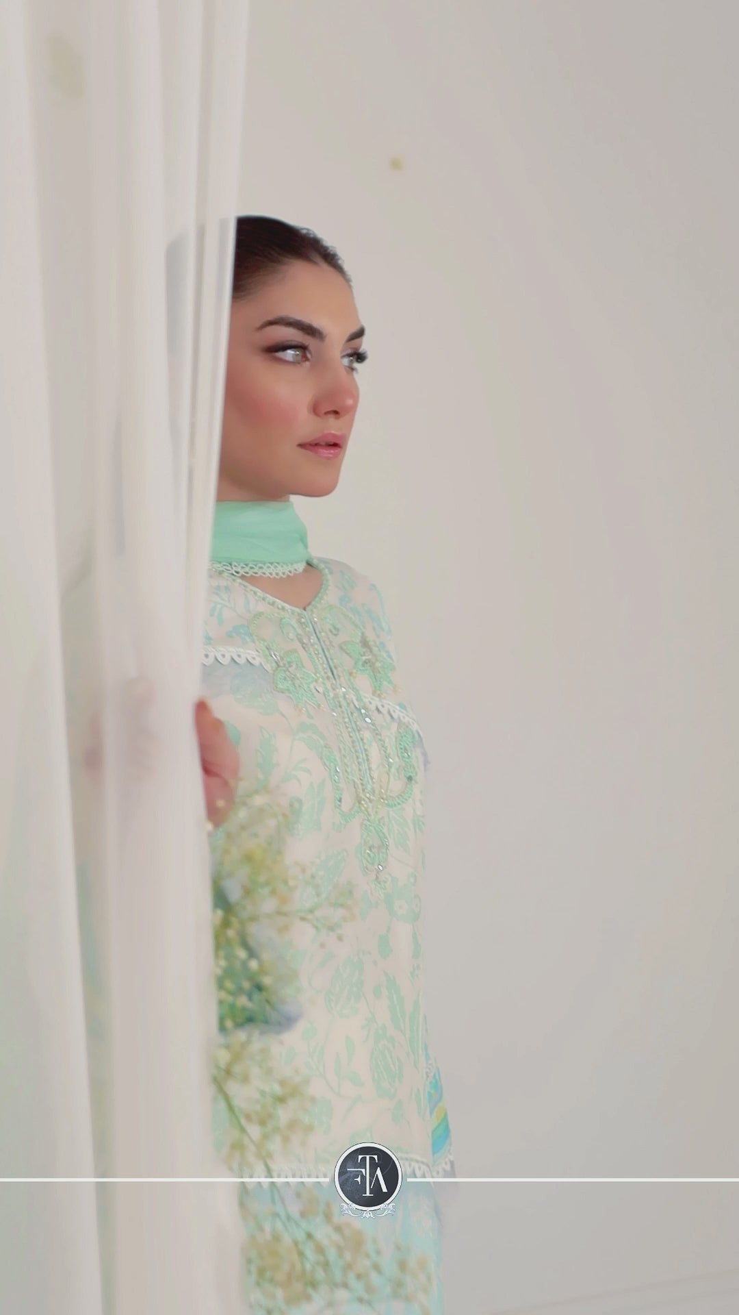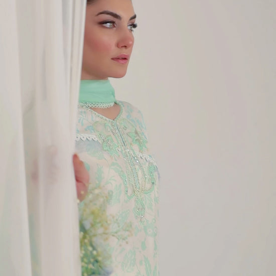 The graceful relaxed fit shirt is paired with an aqua, pure chiffon dupatta with organza detailing.