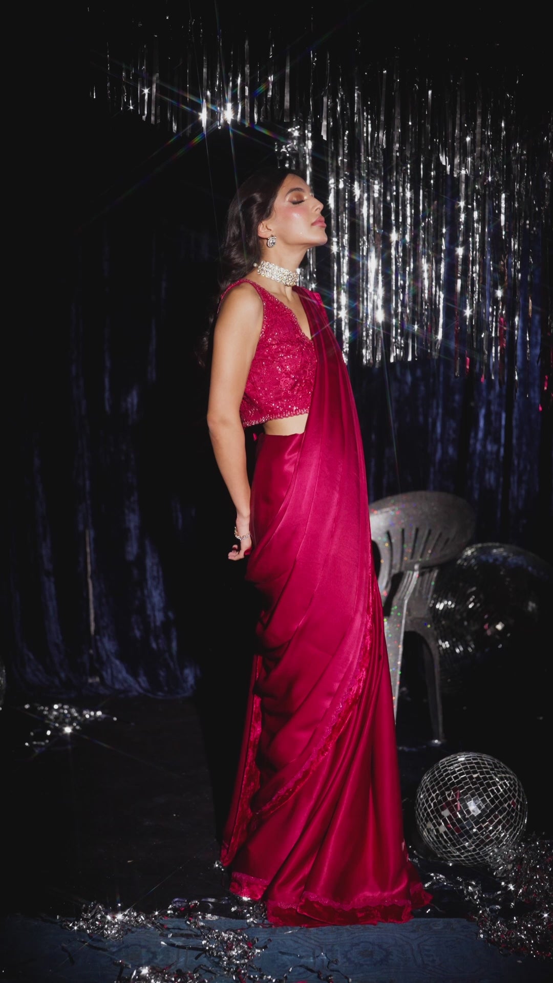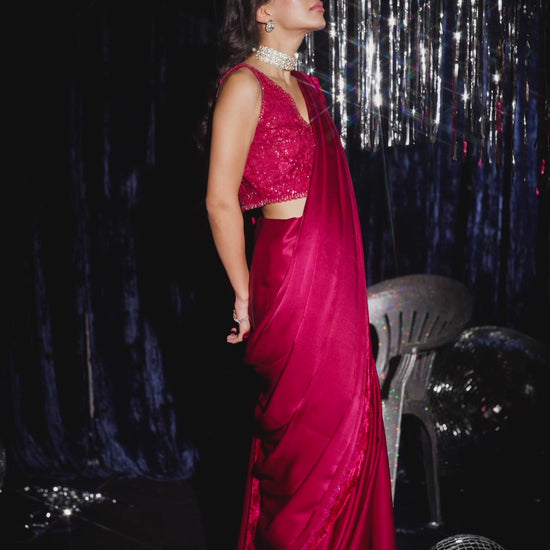 Timeless glamour, for those who want to make an impact. Sleek, monochromatic and spellbinding — the Carmine Saree will make you the belle of any ball. Cascading yards of bewitching scarlett charmeuse silk are adorned with a luscious velvet border, layered with stunning, intricate embroidery. The striking blouse, cut from plush velvet, is richly hand-embellished with coordinating sequins. Pre-draped and effortlessly wearable, the Carmine Saree is a striking style statement — perfect for any occasion you really want to make a splash.
