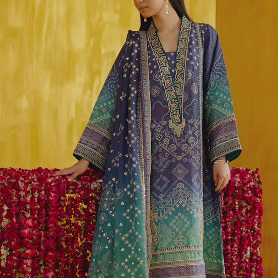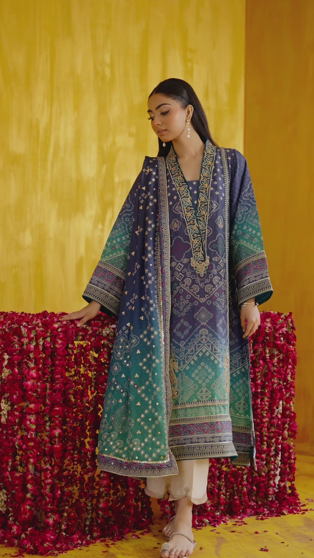 Playful yet refined — this digitally printed, pure raw silk kurta is brought to life with a richly embroidered neckline, hand worked with contrasting appliqués, sequins, and zari for a striking finish. Smoothly flowing from a deep navy blue to a vibrant teal hue, the irresistible ombre is a must have. Handcrafted embroidery motifs along the hem add a contemporary twist to its traditional silhouette. A printed silk dupatta delicately scattered with sequins, completes your ensemble. Pair yours with our impeccably tailored raw silk izaar to strike the perfect balance between elegance and festivity.