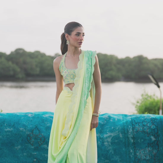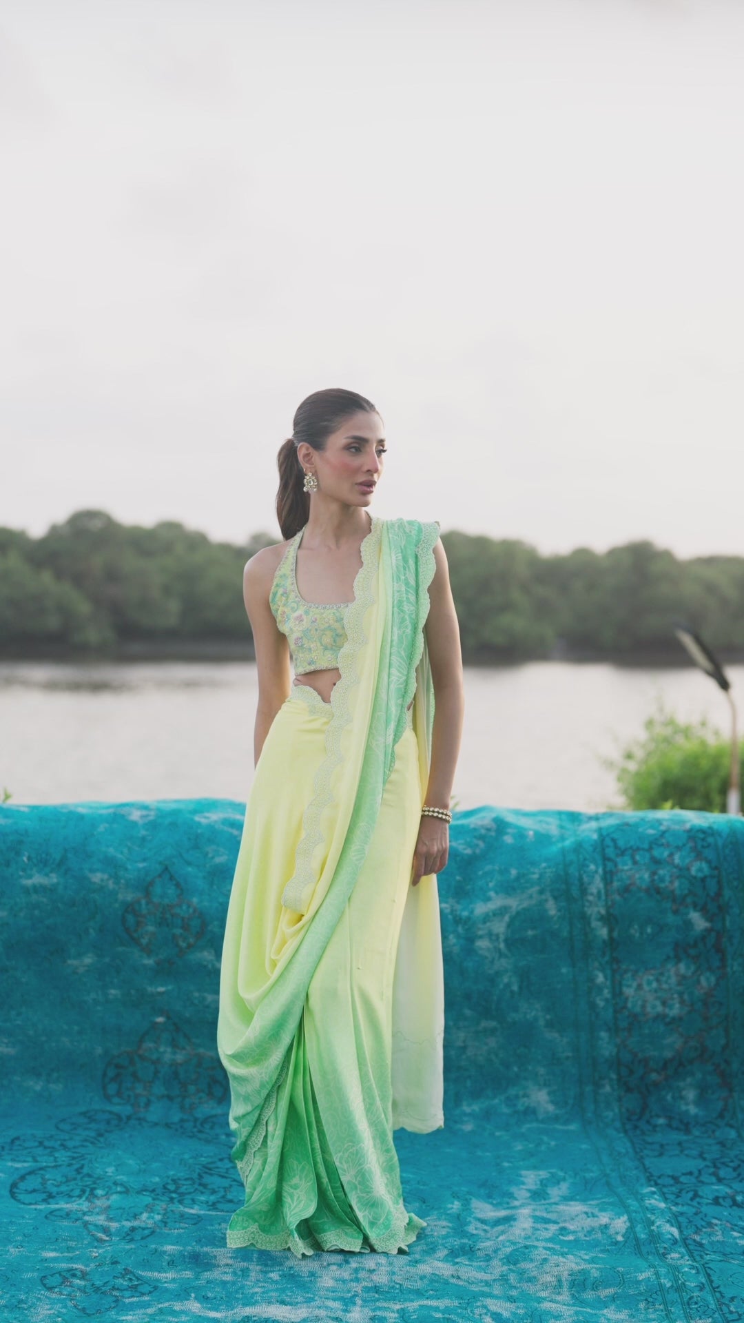 The nostalgic silhouette of a timeless saree is given a contemporary twist with a whimsical ombre digital print. A tangy lemon hue hue flows seamlessly into a citrusy green with a subtle print, making the saree utterly gorgeous. The saree is paired with a sumptuous green blouse, cut from pure raw silk. The blouse is fully hand worked with sequins and Swarovski crystals.