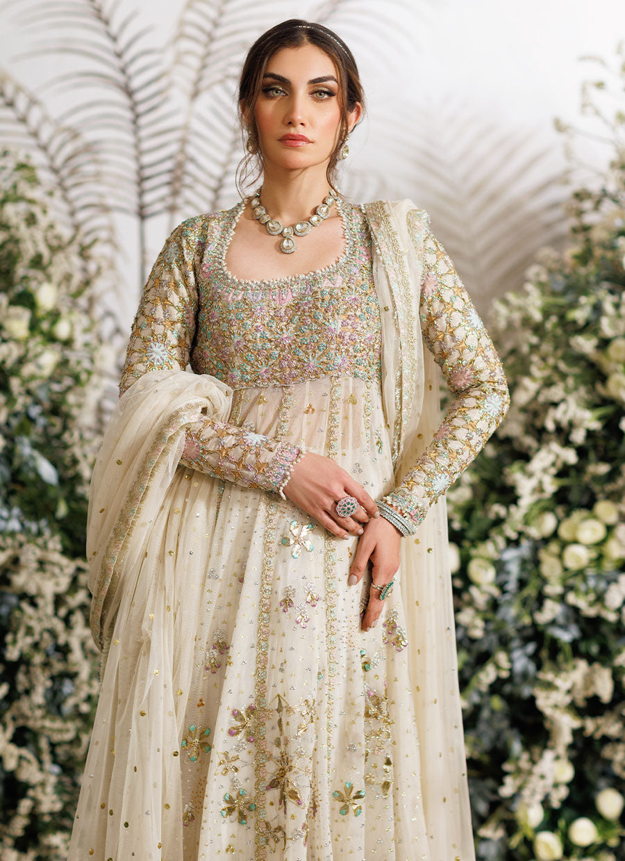 The gorgeous sheer kalidaar is layered over a subtly shimmering, zari tiered lehgna for an incredible flair and an amazingly flattering silhouette. A cascading pure net dupatta is hand embellished with shimmering gota and kaamdaani and an embroidered border make this the ideal choice for intimate occasions.