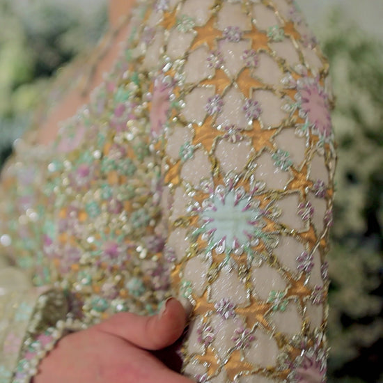 This ensemble is an intricately hand-crafted from pure ivory net, brought to life with appliqués in shades of rose pink, mint, aqua golds and silvers on the bodice and borders. The traditional gota work mixed with intricate Swarovski crystals and zardozi bring the outfit to life.