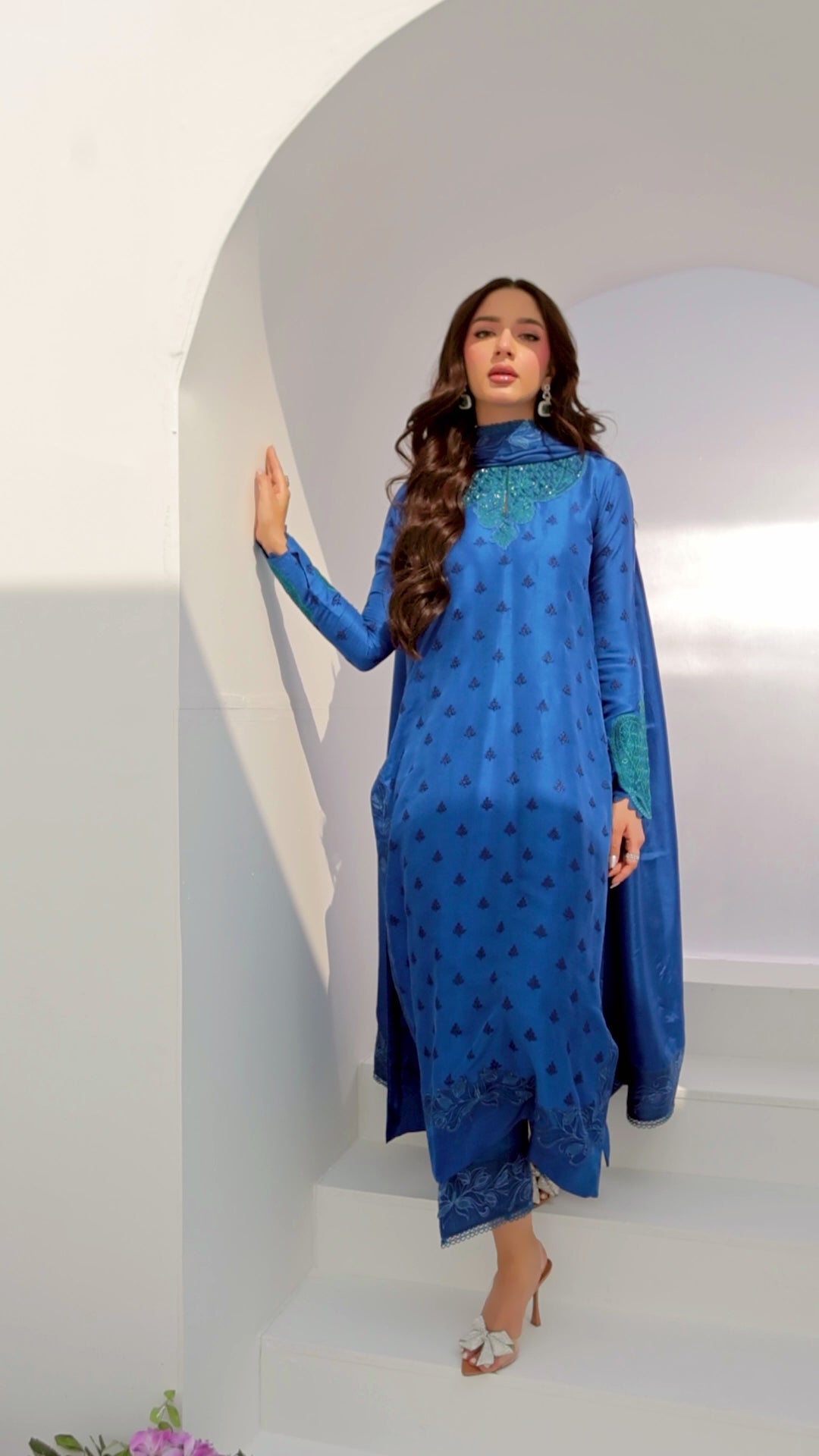A lush ocean blue is richly embroidered with silk thread work and while the universally flattering neckline and sleeves are adorned with an array of sparkling Swarovski crystals, pearls and sequins. Delicate embroidered motifs add the perfect amount of glamour.