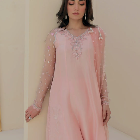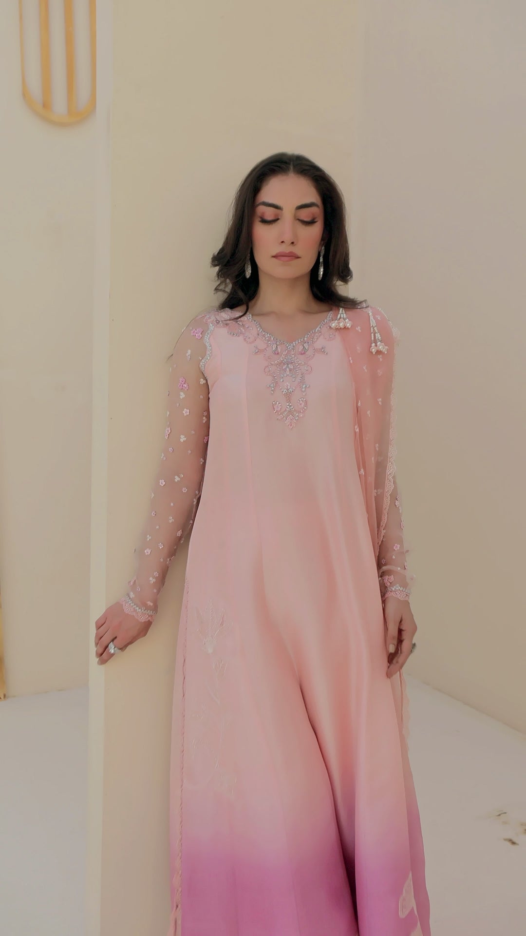 Don’t miss out on the timeless elegance and unmatched versatility of our Deedee ensemble.A canvas of dreamy pale pink fluidly darkens into a darker hue is adorned with stunning composed embroidery in silver and pearls. Delicate florals bloom along the front and back necklines, while the sleekly fitted sleeves, cut from organza are dotted with sequins, as well as mini 3D flowers. Gorgeous hand worked florals adorn the side slits in the front. The accompanying ethereal organza dupatta with trimmed with scallop lave completes your ensemble. Eternally stylish, irresistible details will make this one of your smartest buys this season!