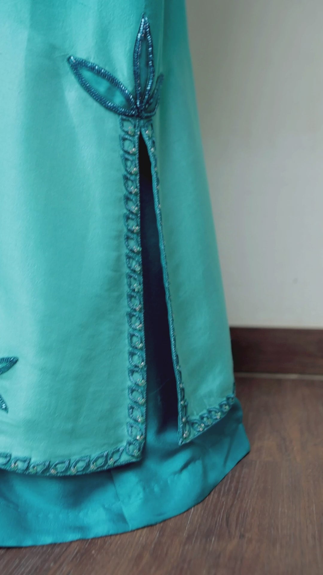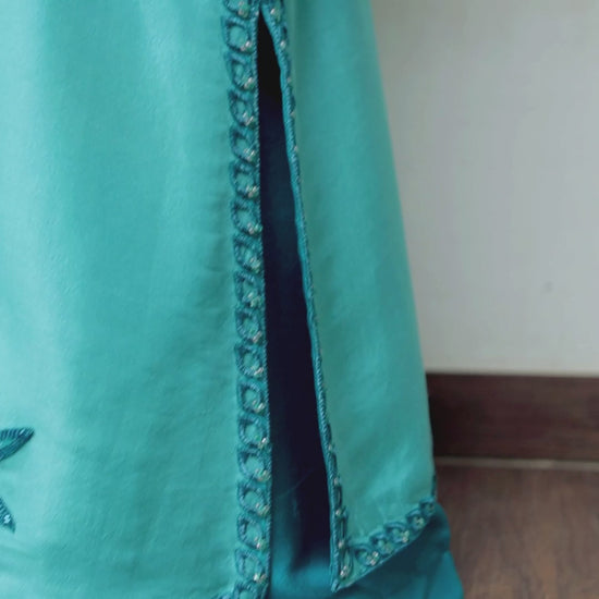 A striking teal shirt, cut from pure raw silk that seamlessly flows into a lighter teal hue features a delicately hand embroidered modern neckline and a dramatic A-line silhouette.
