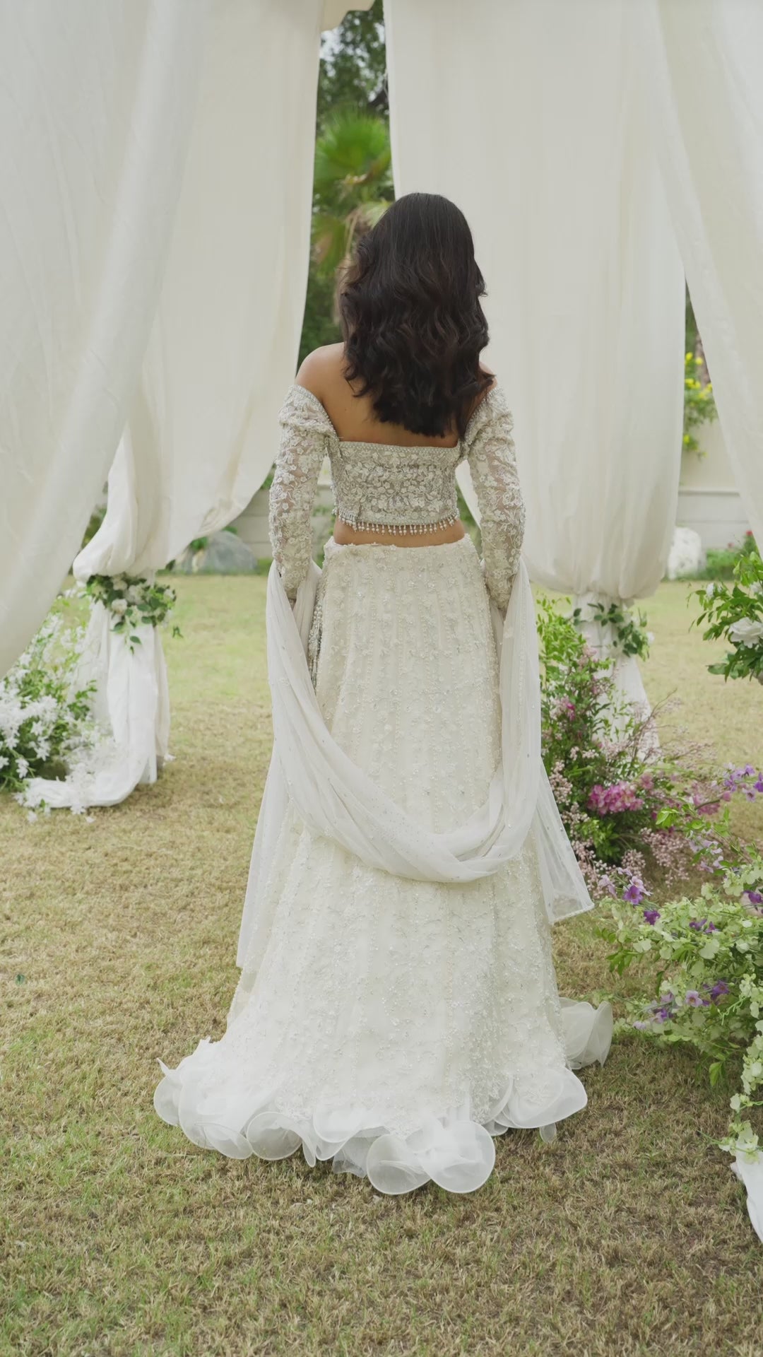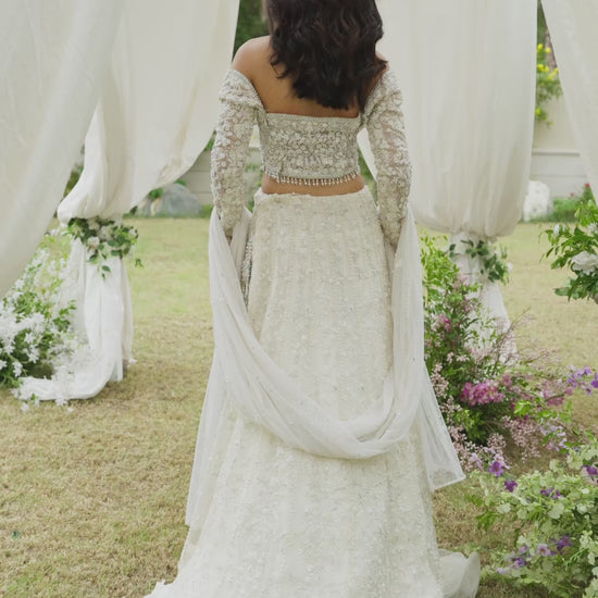 • Lehenga: Hand-embellished ivory lehenga with intricate resham and Swarovski detailing, flowing gracefully for a timeless silhouette.