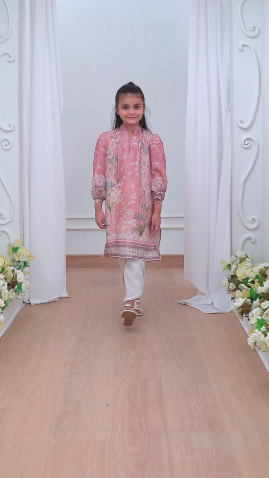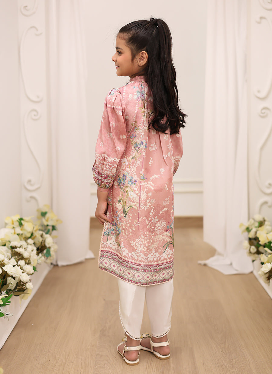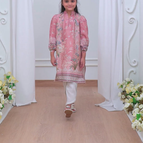 This chai pink soft floral printed raw silk kurta for young girls is a dreamy blend of elegance and whimsy. The warm, muted chai pink hue is complemented by a delicate floral print that adds a touch of grace and charm. The luxurious raw silk fabric has a soft, smooth texture with a subtle sheen, making it both comfortable and stylish. The kurta features feminine puffed sleeves that give it a playful, youthful silhouette, while the relaxed fit ensures ease of movement. Perfect for festive occasions, family gatherings, or celebrations, this kurta combines traditional beauty with a modern, fun twist, making it an ideal choice for young girls who want to stand out with both elegance and charm.