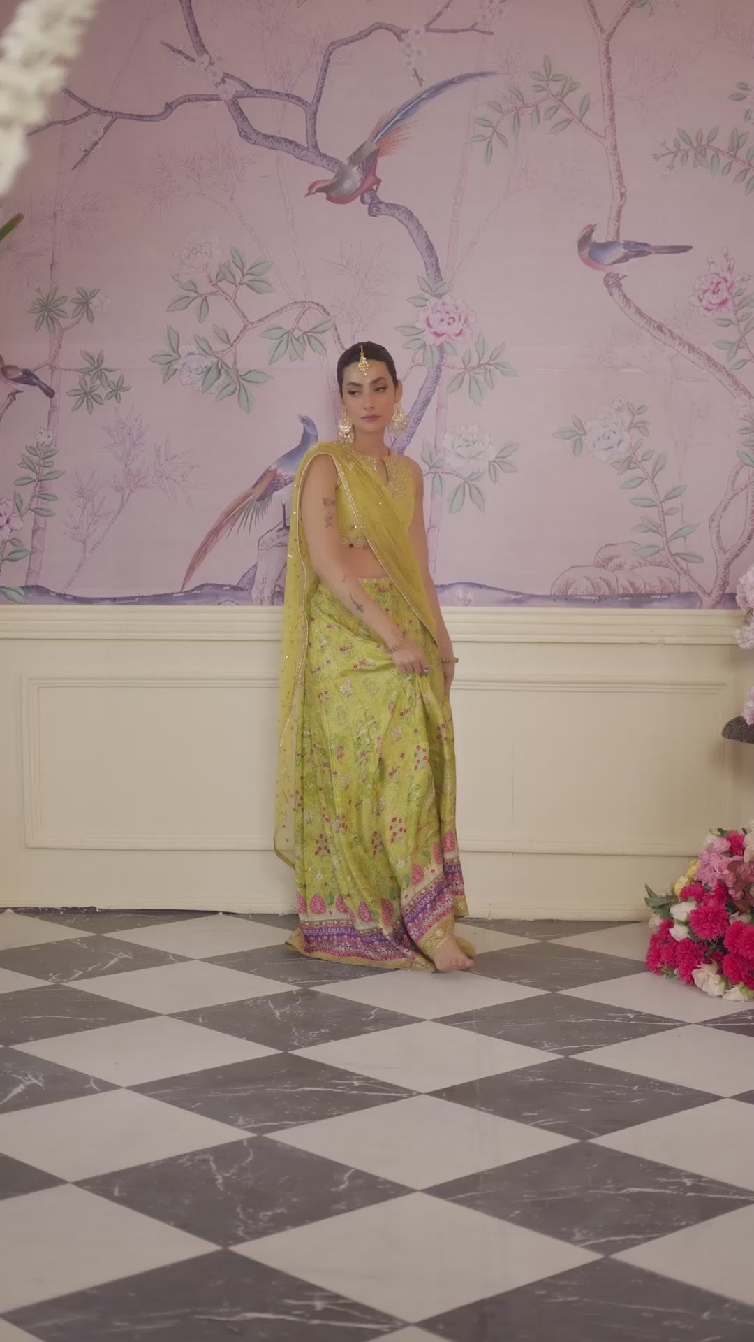 A striking lehnga choli, with an exclusively designed FTA digital print. Cut from pure raw silk, the Elika lime ensemble is flowing, floaty dream for you to indulge in.