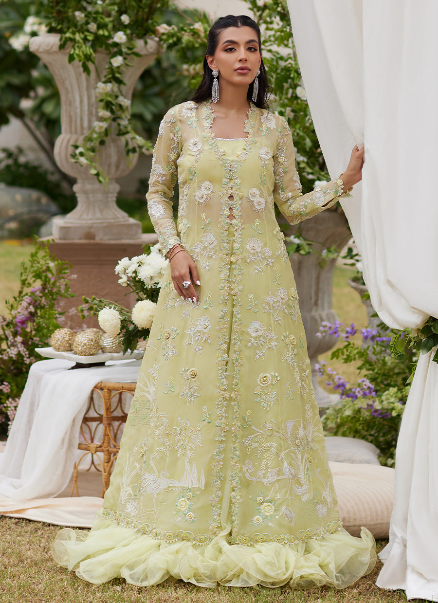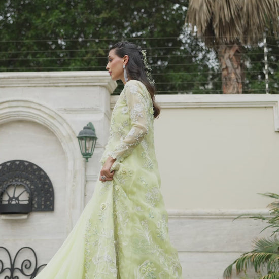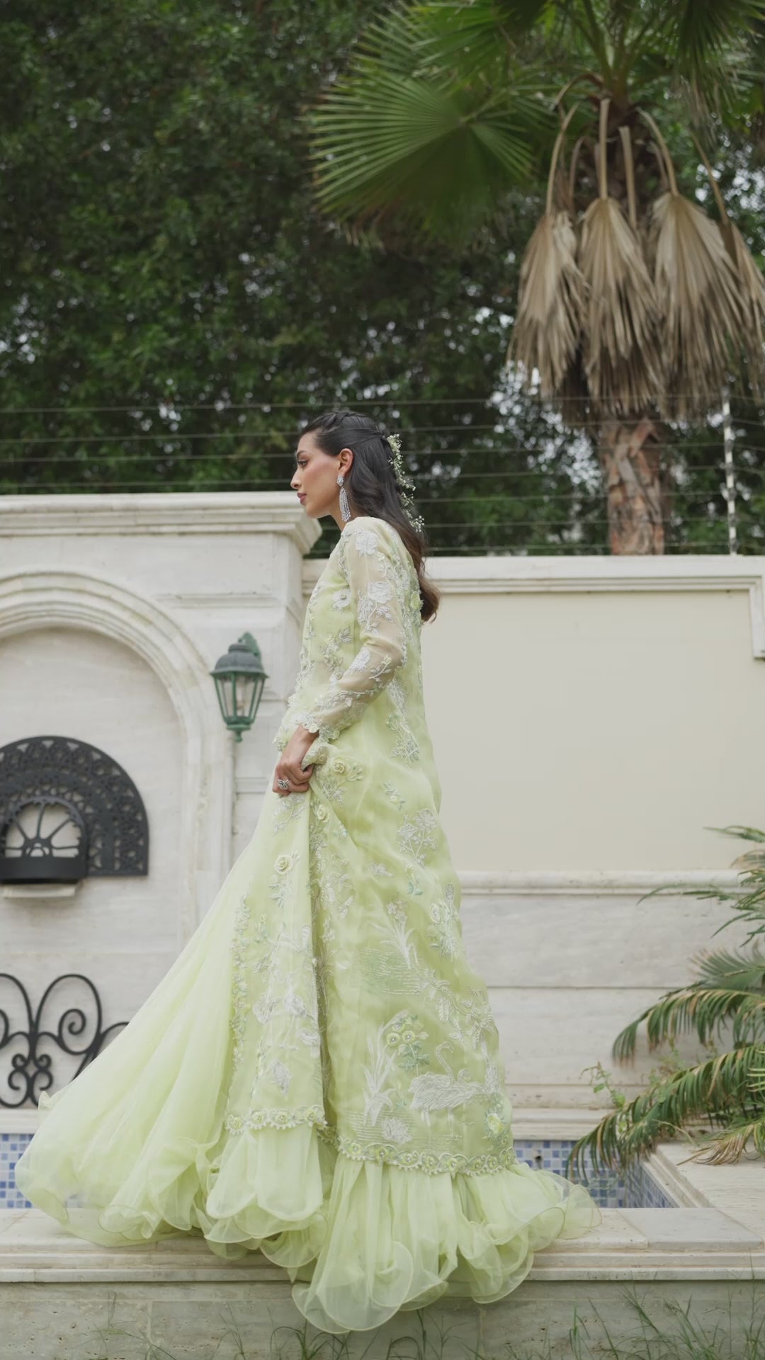 In a gentle shade of pale lemon, this ensemble captures elegance with a contemporary softness. The panelled jacket shimmers with delicate handwork — resham, cutdana, sequins, stones, and appliqué — layered with meticulous artistry. A cutwork bodice enhances the refined detail, while the airy net lehnga flows effortlessly, creating a look that is light, graceful, and quietly luminous.