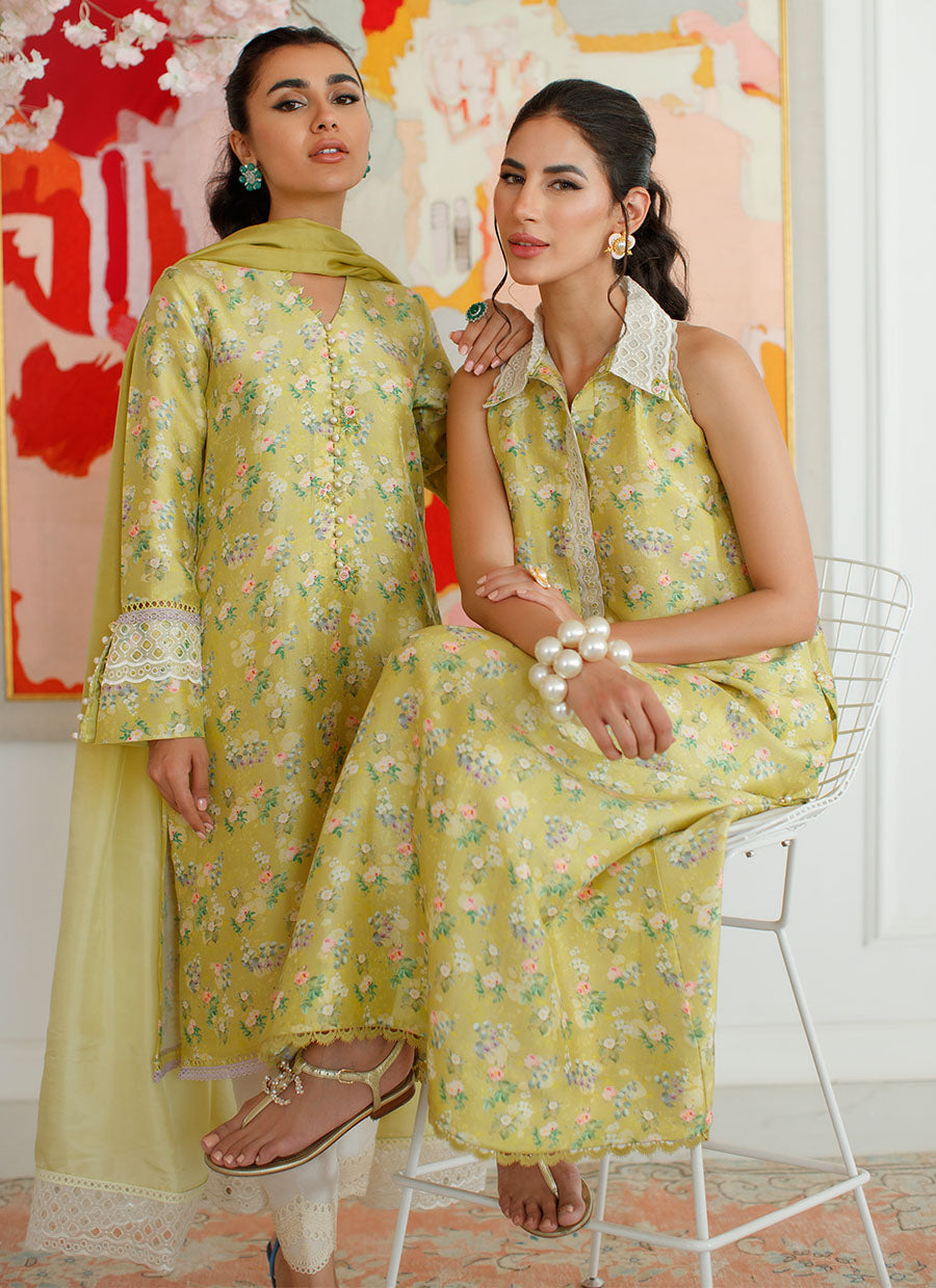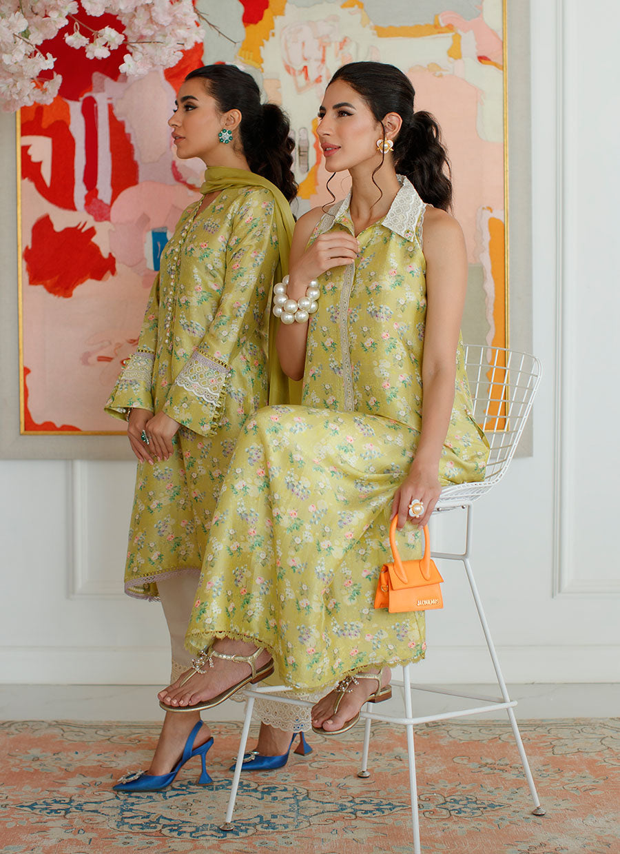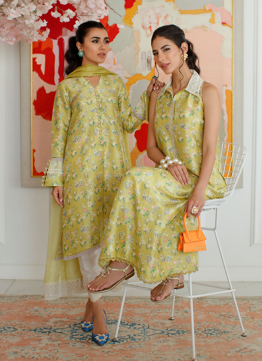 Cut from Pure Raw Silk, Ella Bella Kiwi is a refreshing citrusy kiwi green, printed with blissfully delicate florals. The ankle length hem is adorned with a delicate lace, while the collar is made from eyelet embroidery on silk. All the elements of this outfit come together to create a stunning ensemble, brimming with a modern simplicity.
